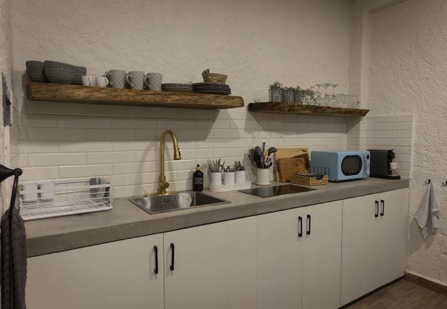 La cucina americana, elettrica, è attrezzata con frigorifero, microonde, congelatore, stoviglie/posate, utensili da cucina, caffettiera e spremi agrumi.