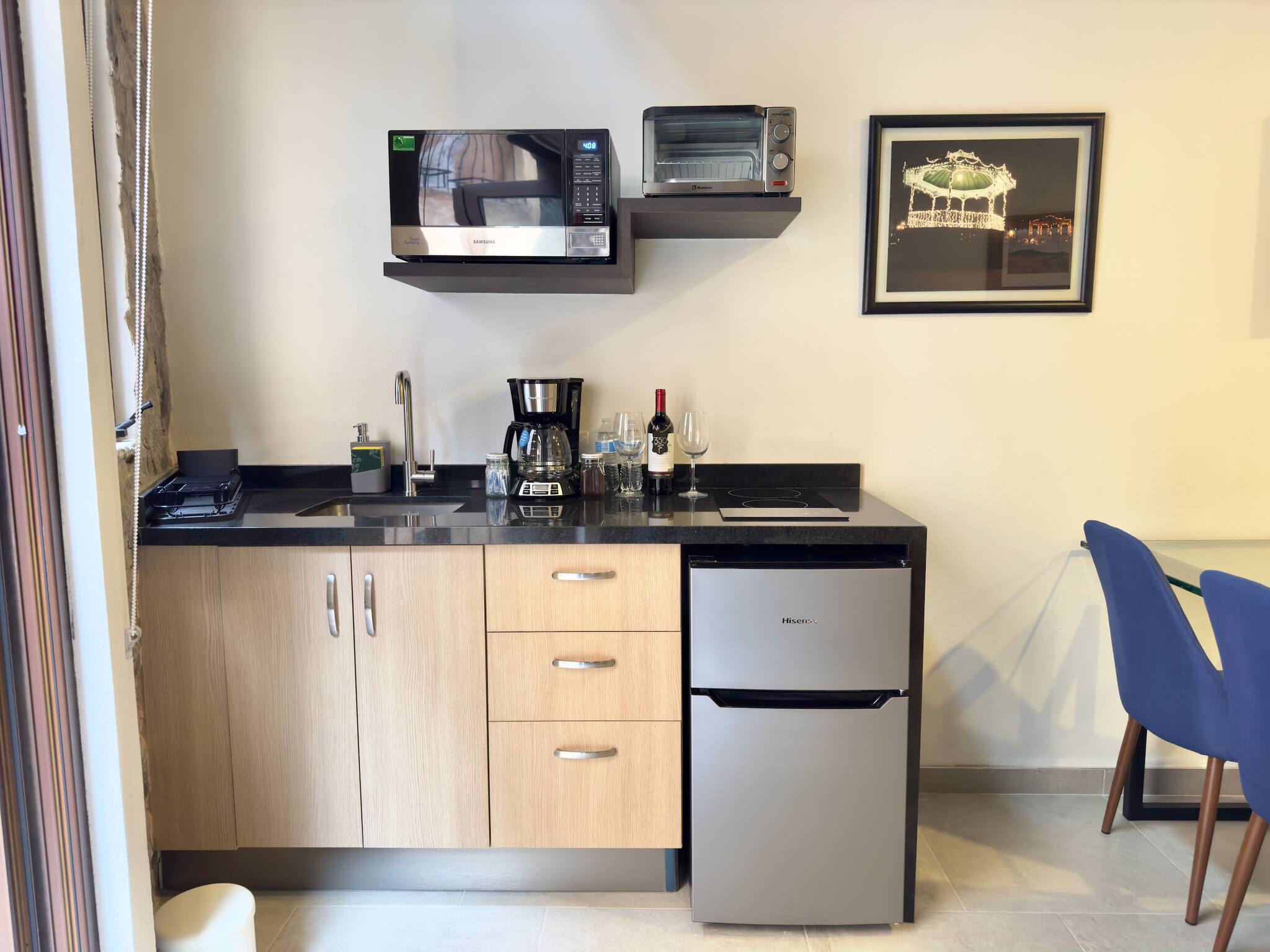 La cucina americana è completamente attrezzata con elettrodomestici all'avanguardia, inclusi piano a induzione, forno a microonde, macchina da caffè, frigorifero e tutti gli utensili necessari per preparare deliziosi pasti. Inoltre, dispone di una pratica zona di lavoro con connessione WiFi per coloro che devono combinare svago e lavoro.