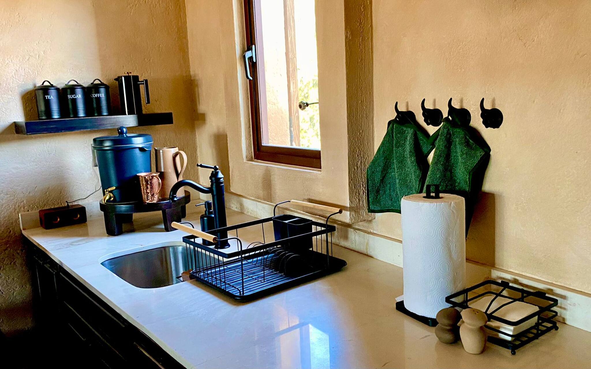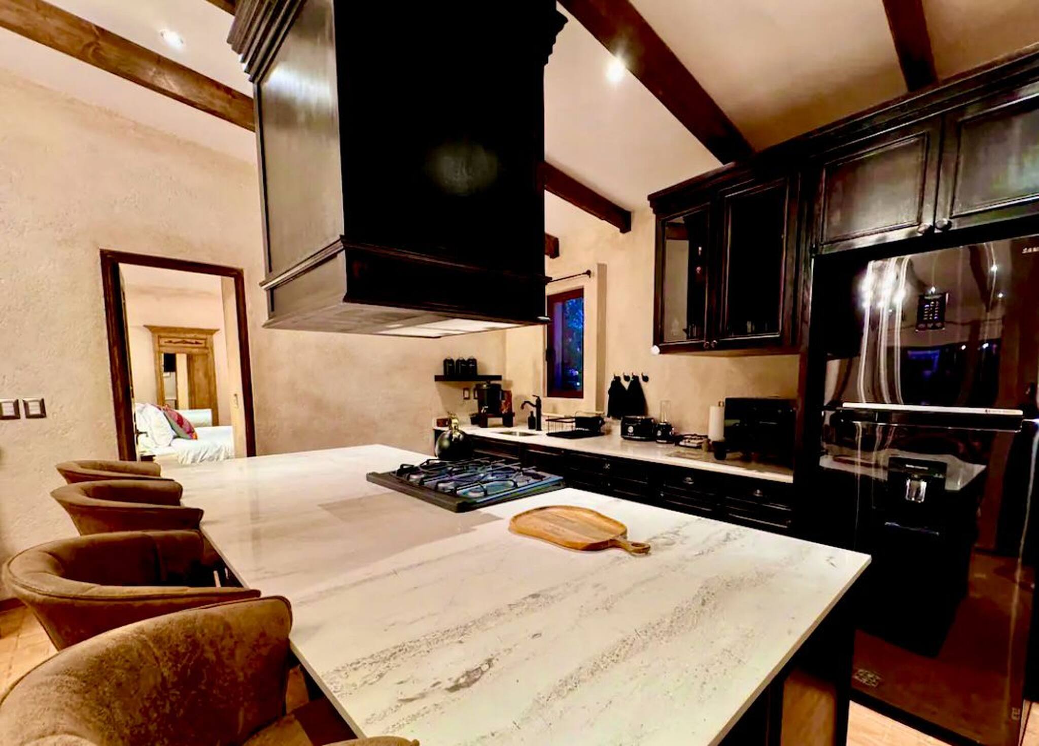La cucina americana, a gas, è attrezzata con frigorifero, microonde, congelatore, stoviglie/posate, utensili da cucina, caffettiera, tostapane, bollitore e fornello.