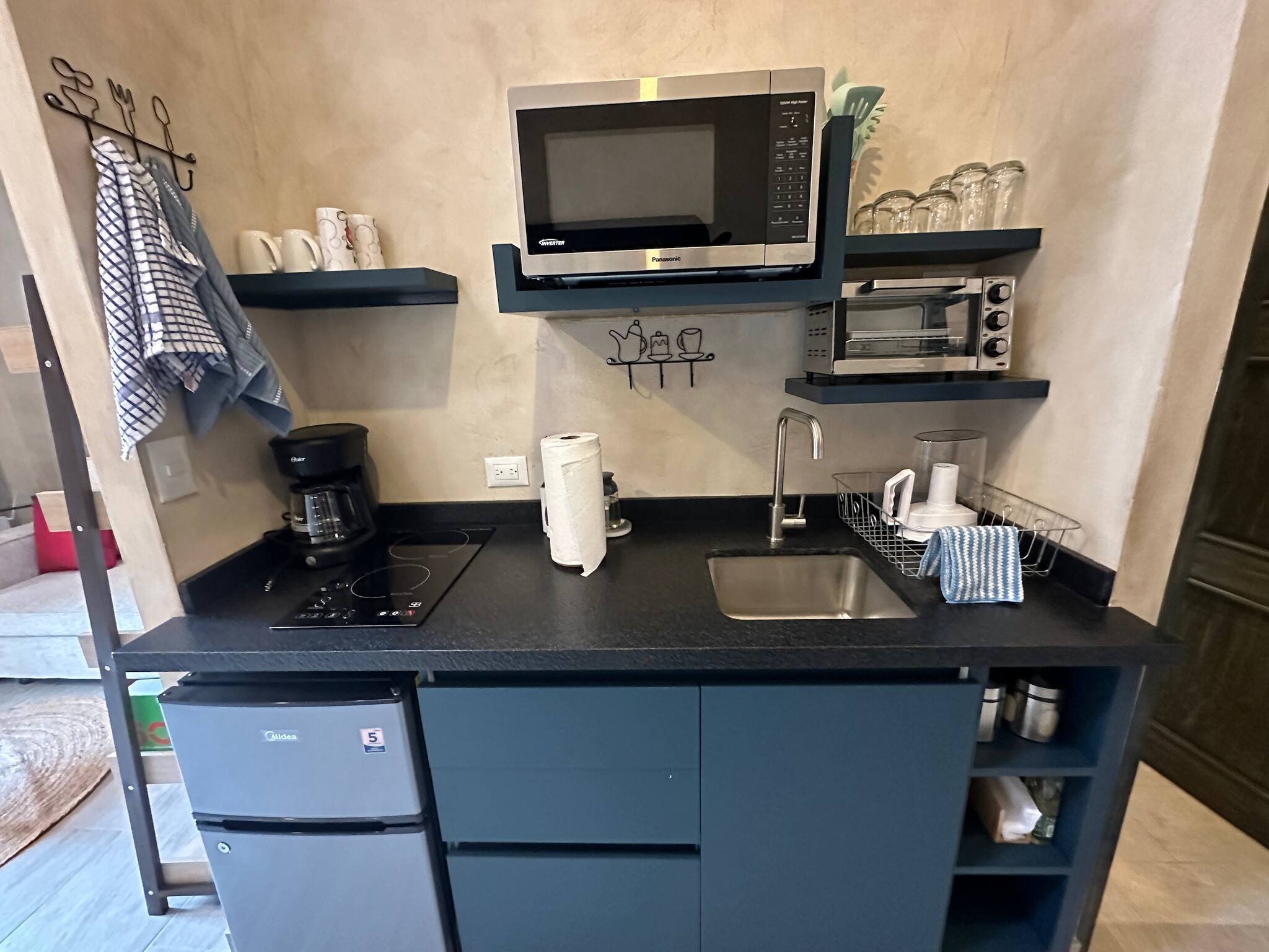 La cucina americana, a induzione, è attrezzata con frigorifero, microonde, stoviglie/posate, utensili da cucina, caffettiera e tostapane.