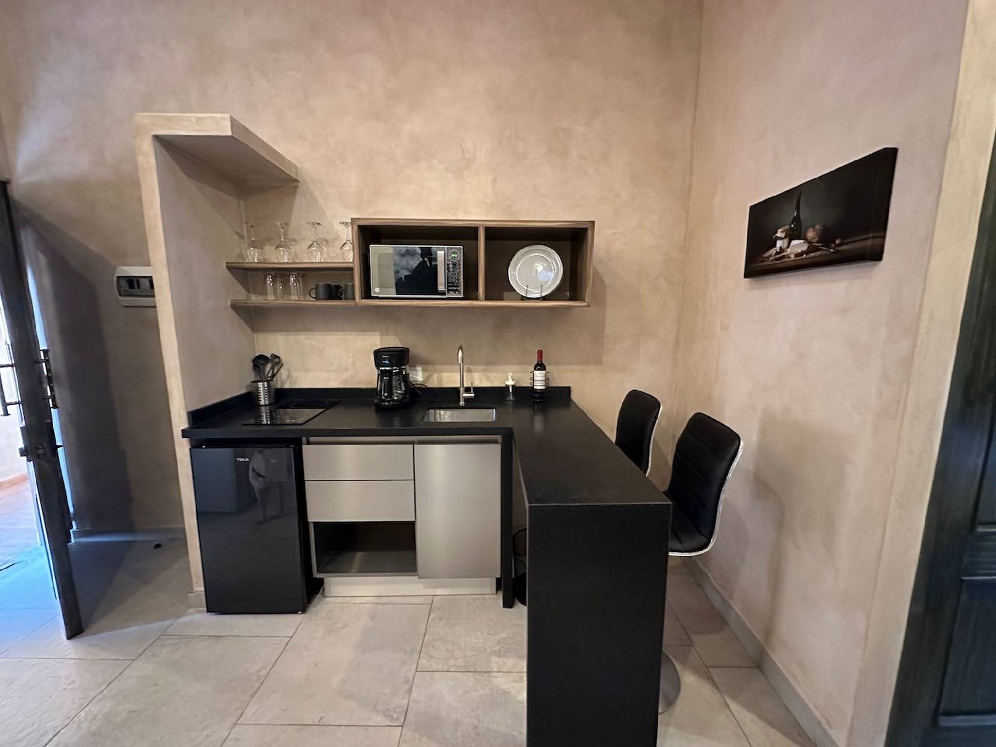La cucina americana è completamente attrezzata con elettrodomestici all'avanguardia, inclusi piano a induzione, forno a microonde, macchina da caffè, frigorifero e tutti gli utensili necessari per preparare deliziosi pasti. Inoltre, dispone di una pratica zona di lavoro con connessione WiFi per coloro che devono combinare svago e lavoro.