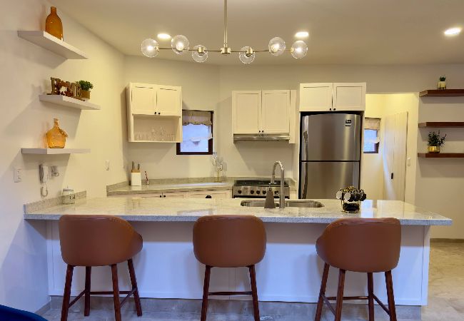 La cucina americana è completamente attrezzata con elettrodomestici all'avanguardia, inclusi piano a induzione, forno a microonde, macchina da caffè, frigorifero e tutti gli utensili necessari per preparare deliziosi pasti. Inoltre, dispone di una pratica zona di lavoro con connessione WiFi per coloro che devono combinare svago e lavoro.