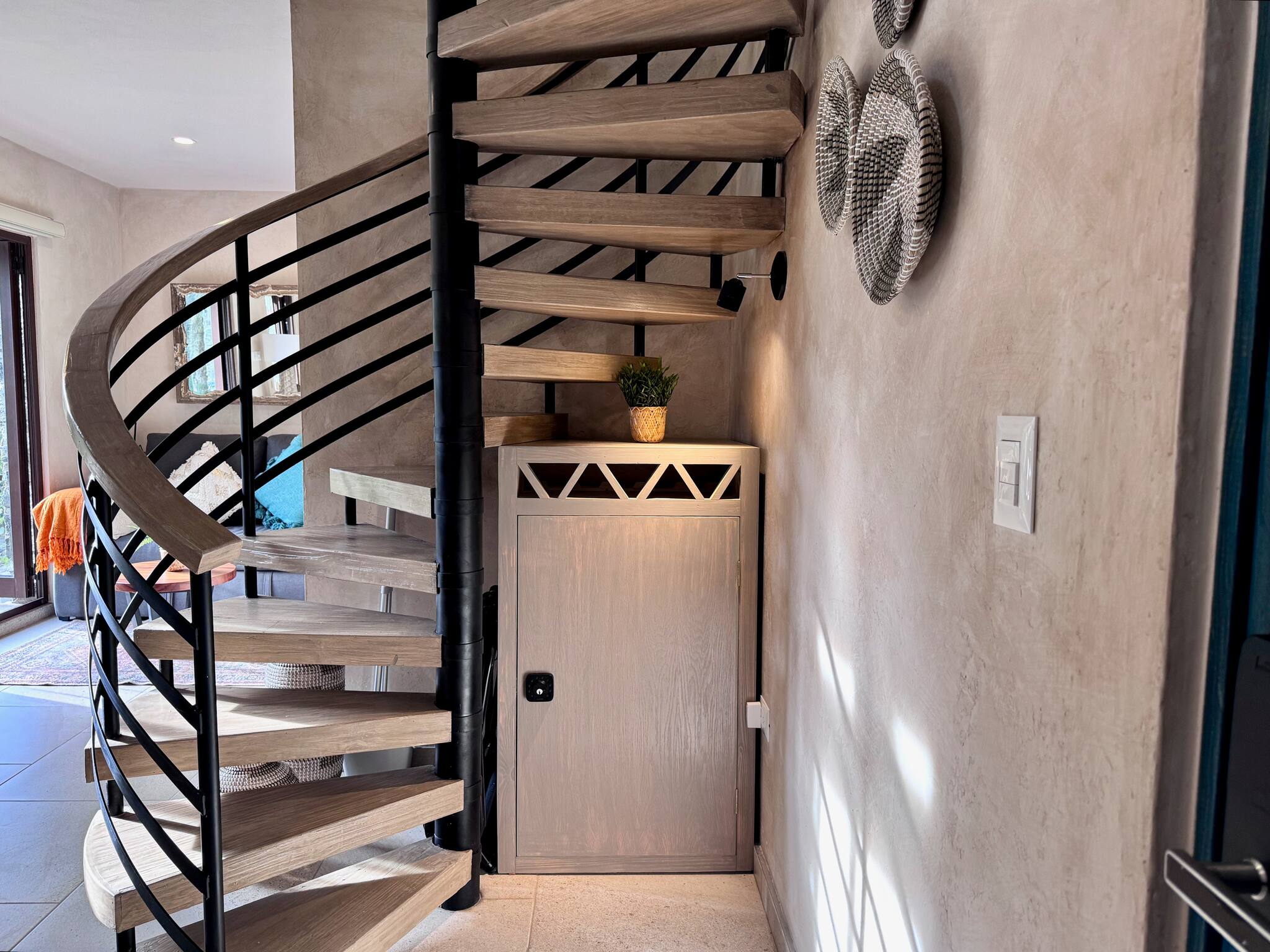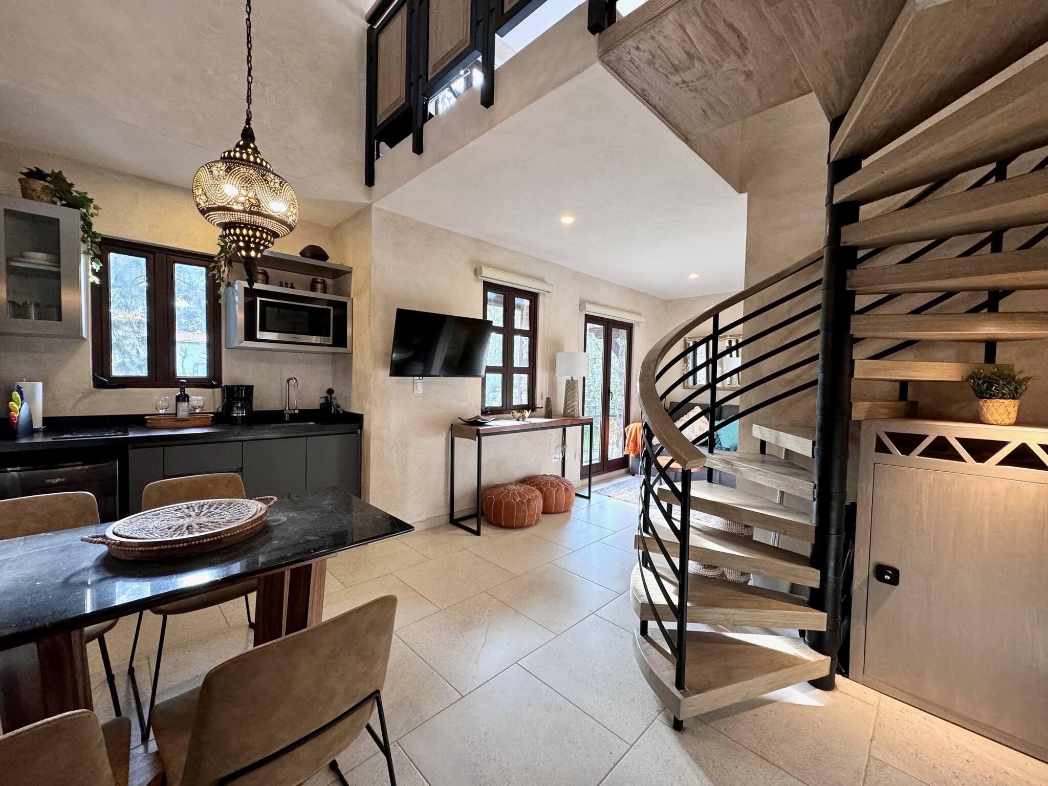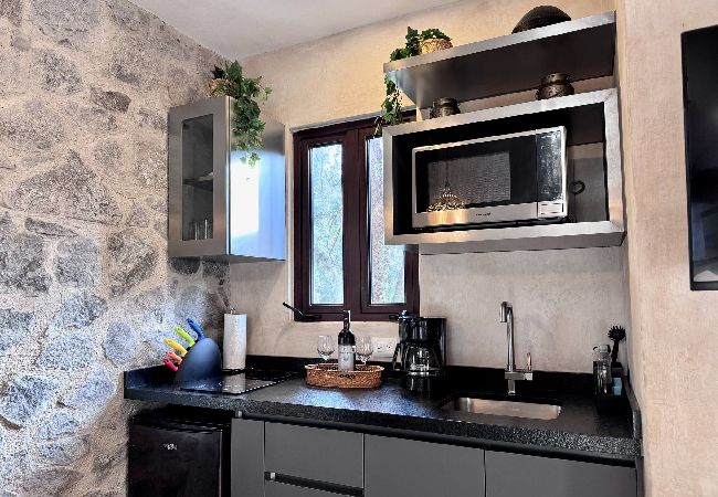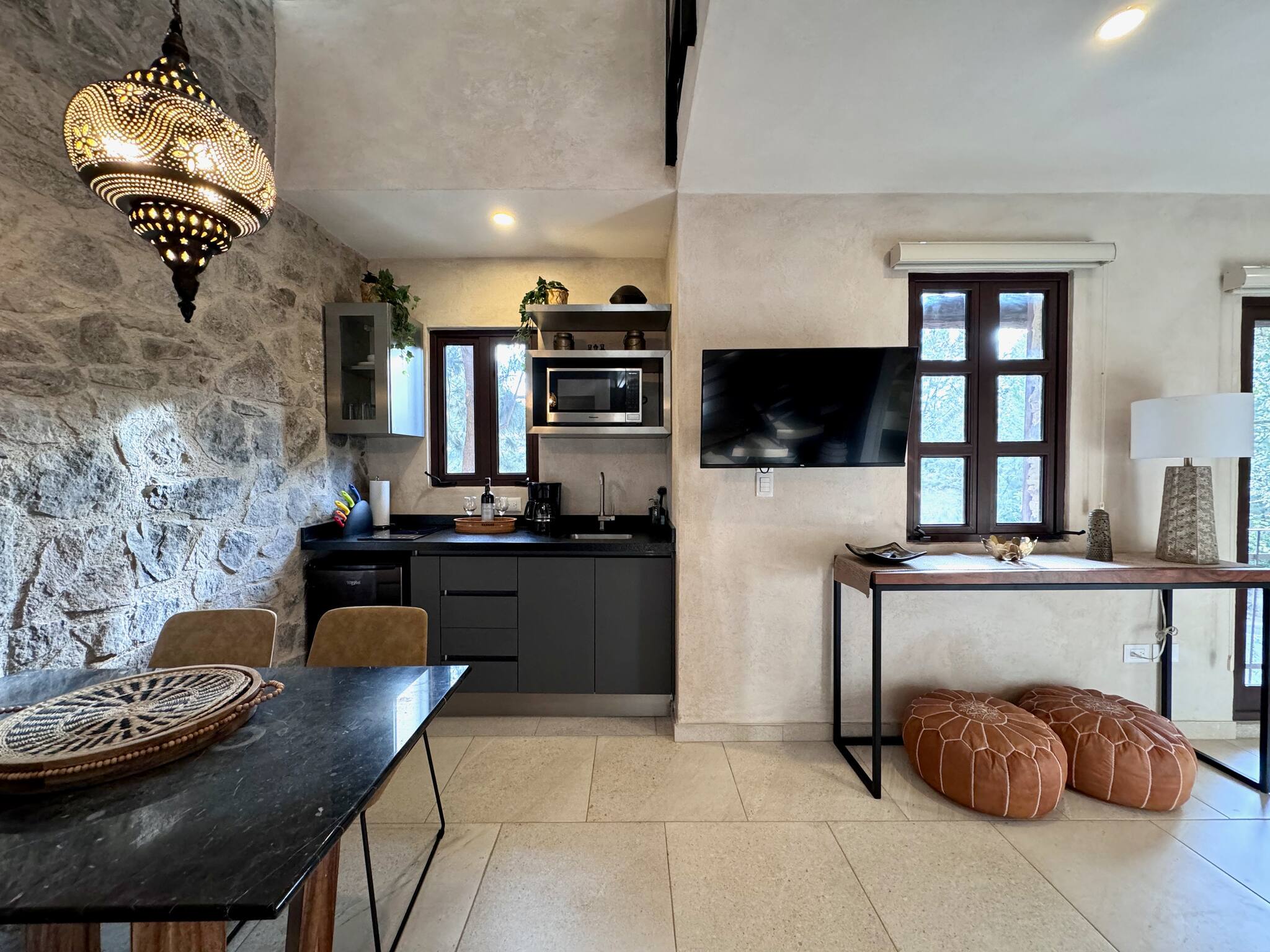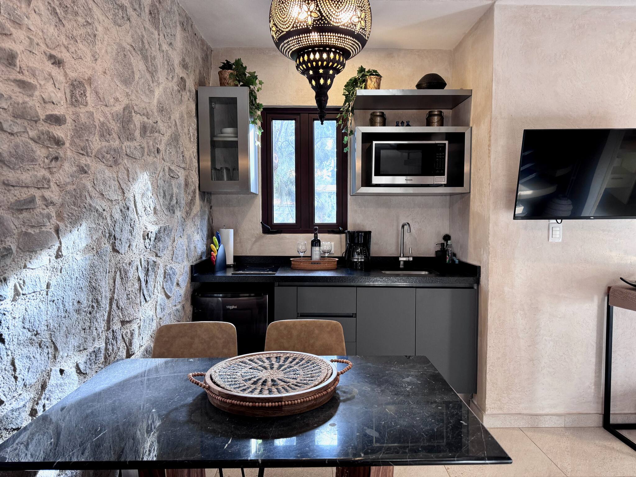 La cocina americana, de inducción, está equipada con refrigerador, microondas, vajilla/cubertería, utensilios/cocina, cafetera y hervidor de agua.