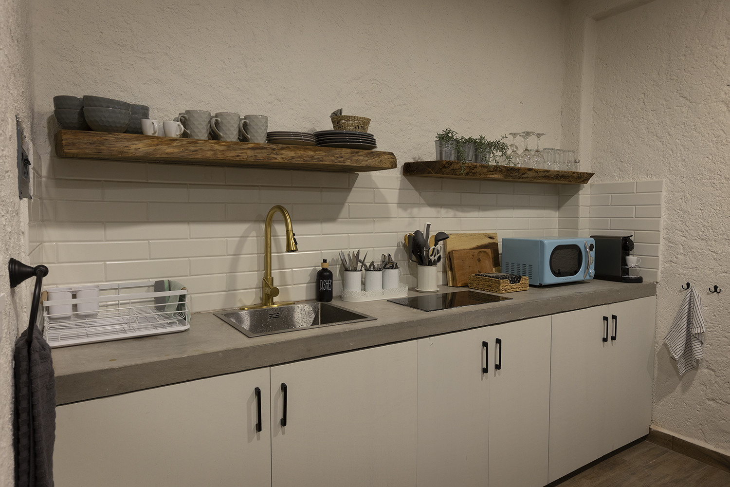La cocina americana, eléctrica, está equipada con refrigerador, microondas, congelador, vajilla/cubertería, utensilios/cocina, cafetera y exprimidor.