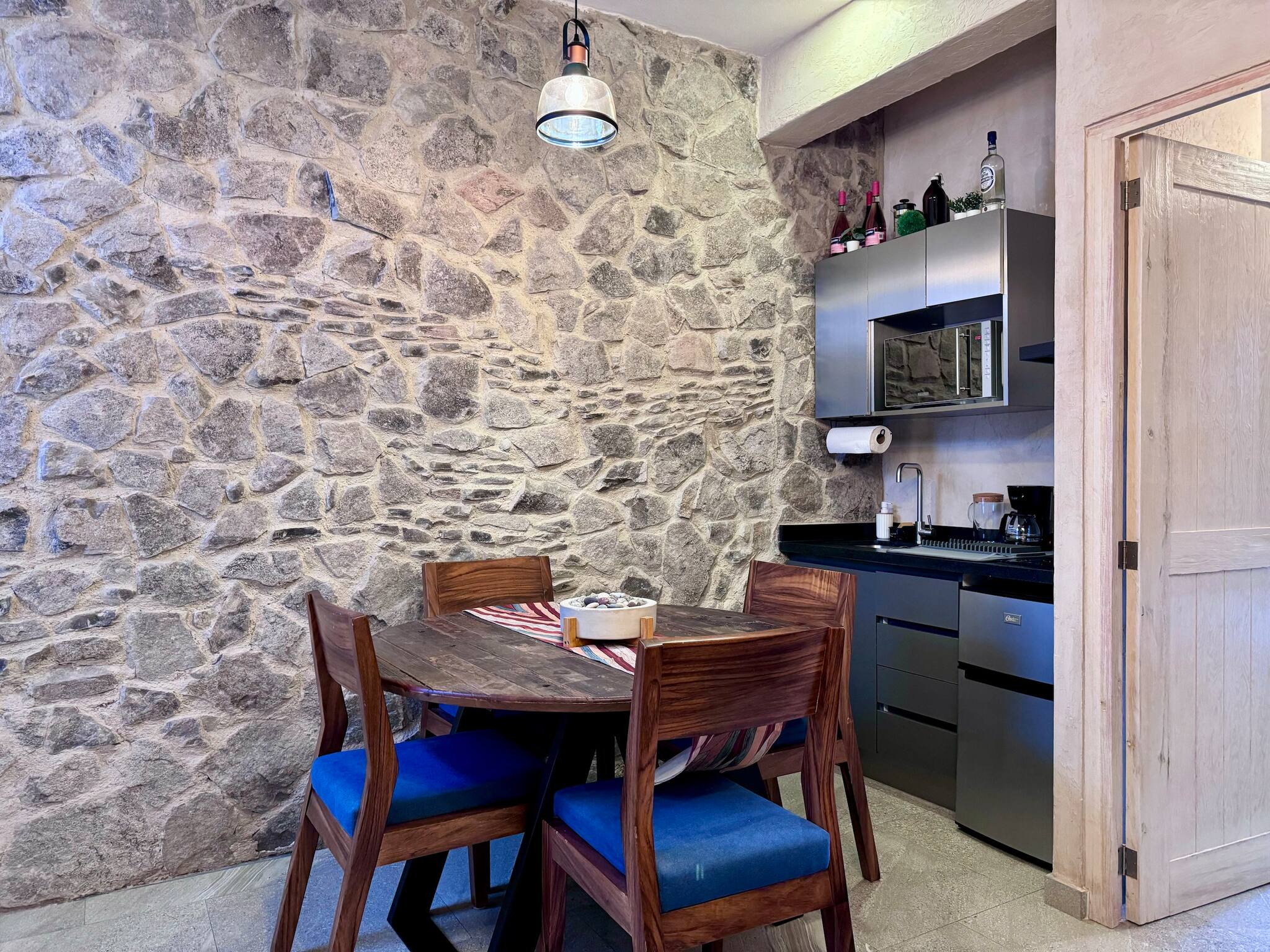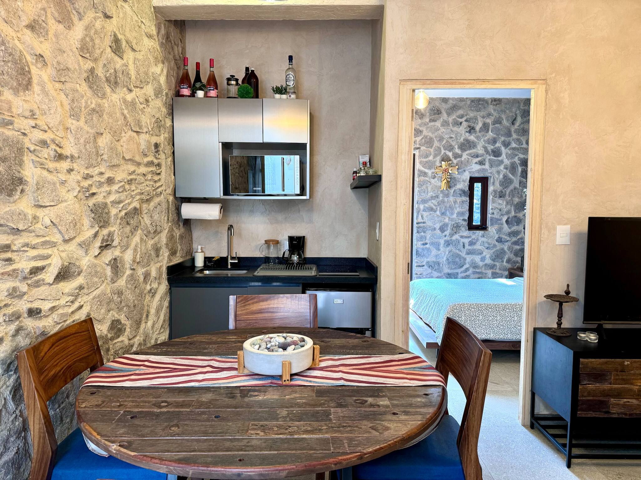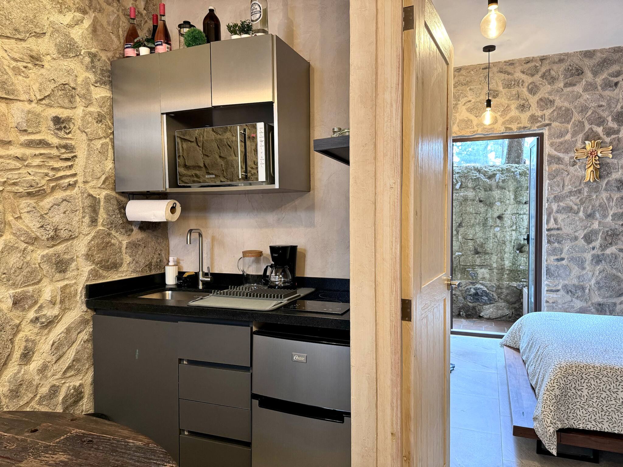 La cocina americana, de inducción, está equipada con refrigerador, microondas, vajilla/cubertería, utensilios/cocina y cafetera.