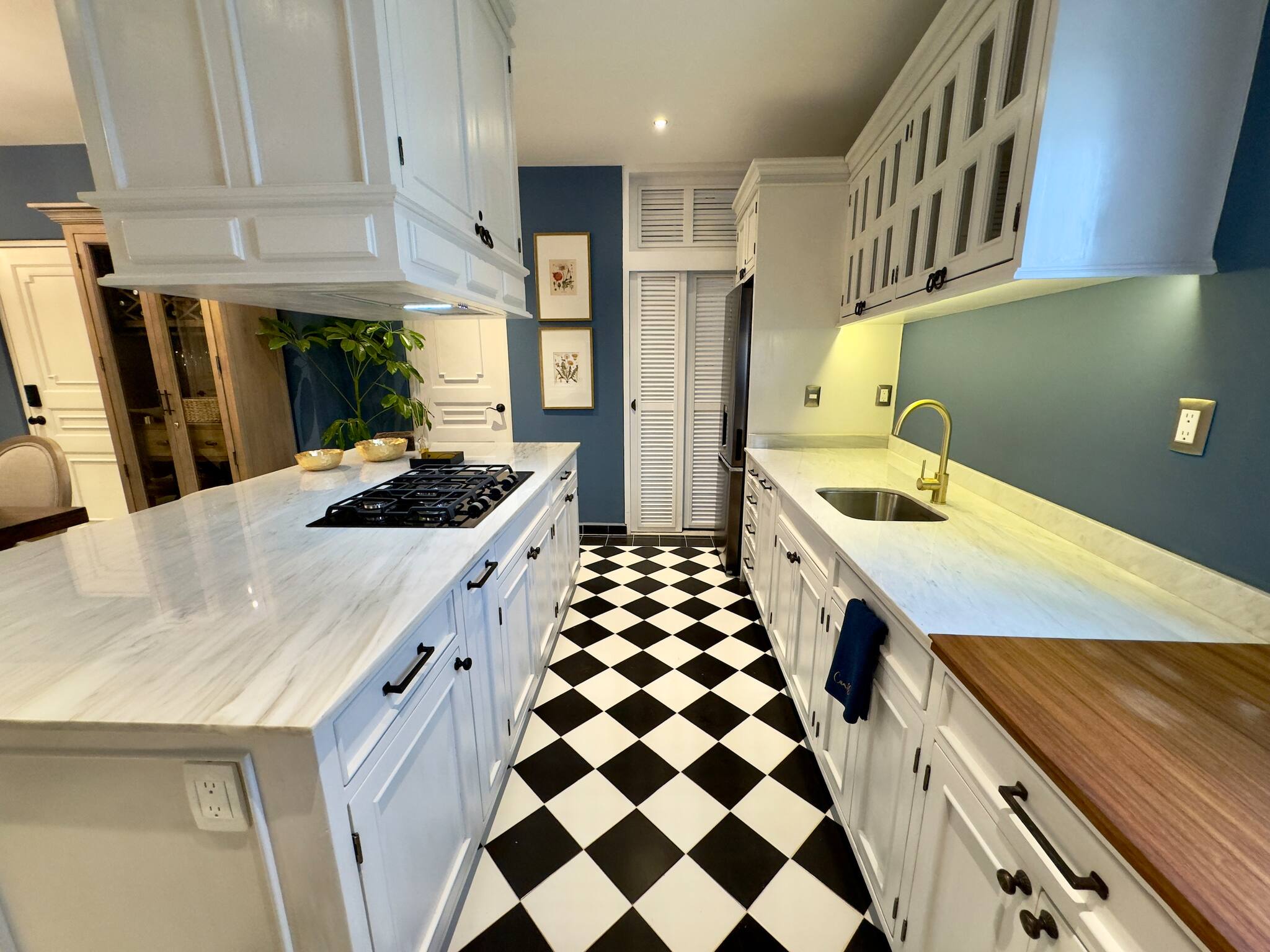 La cocina americana, de gas, está equipada con refrigerador, microondas, congelador, vajilla/cubertería, utensilios/cocina, cafetera, tostador, hervidor de agua y fogones.