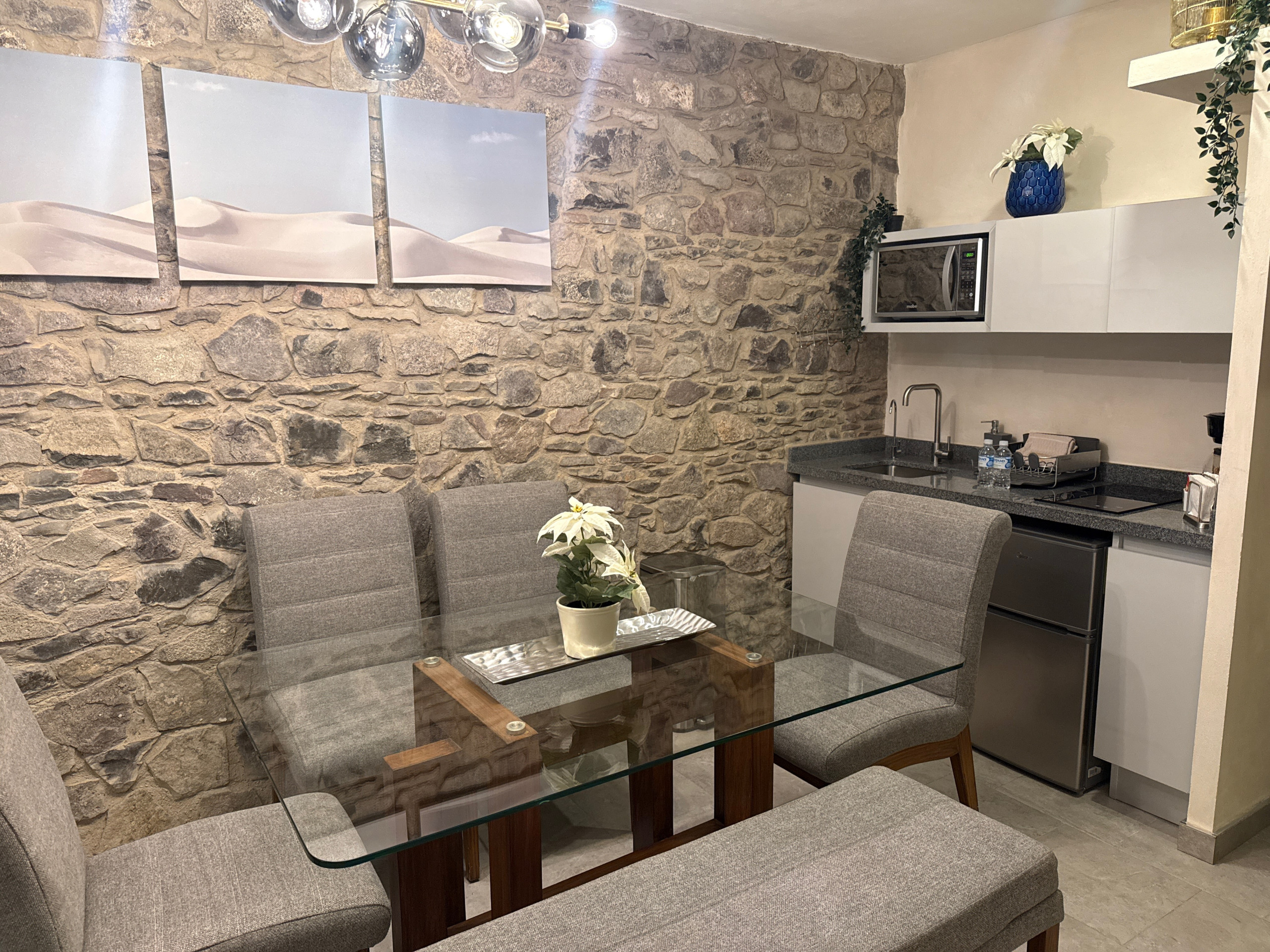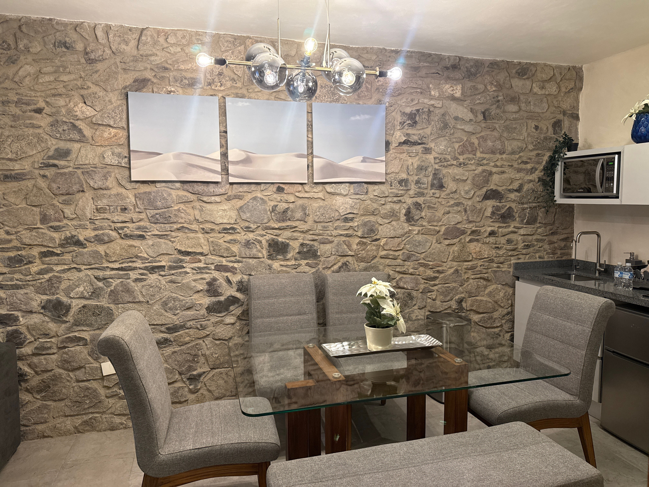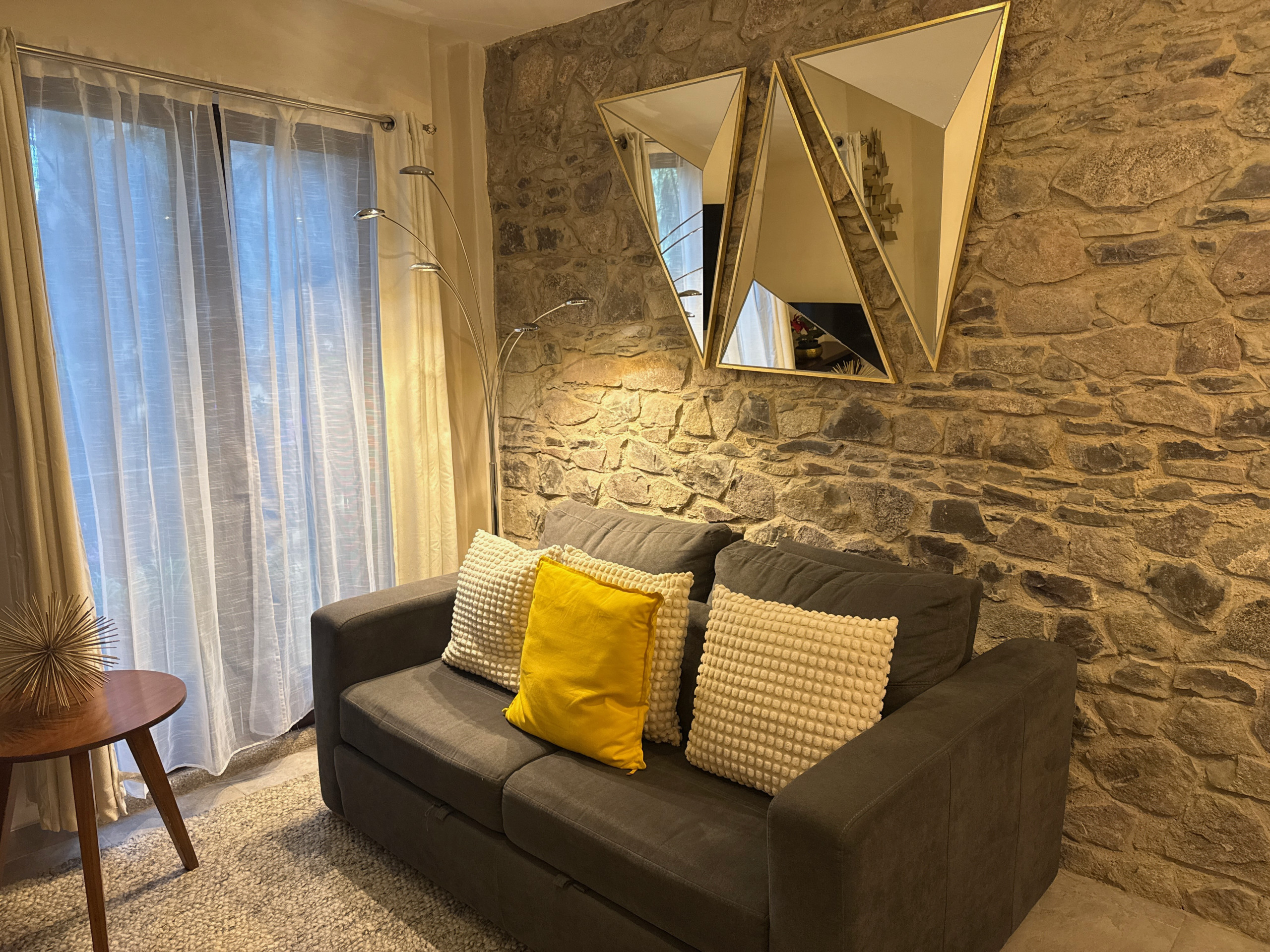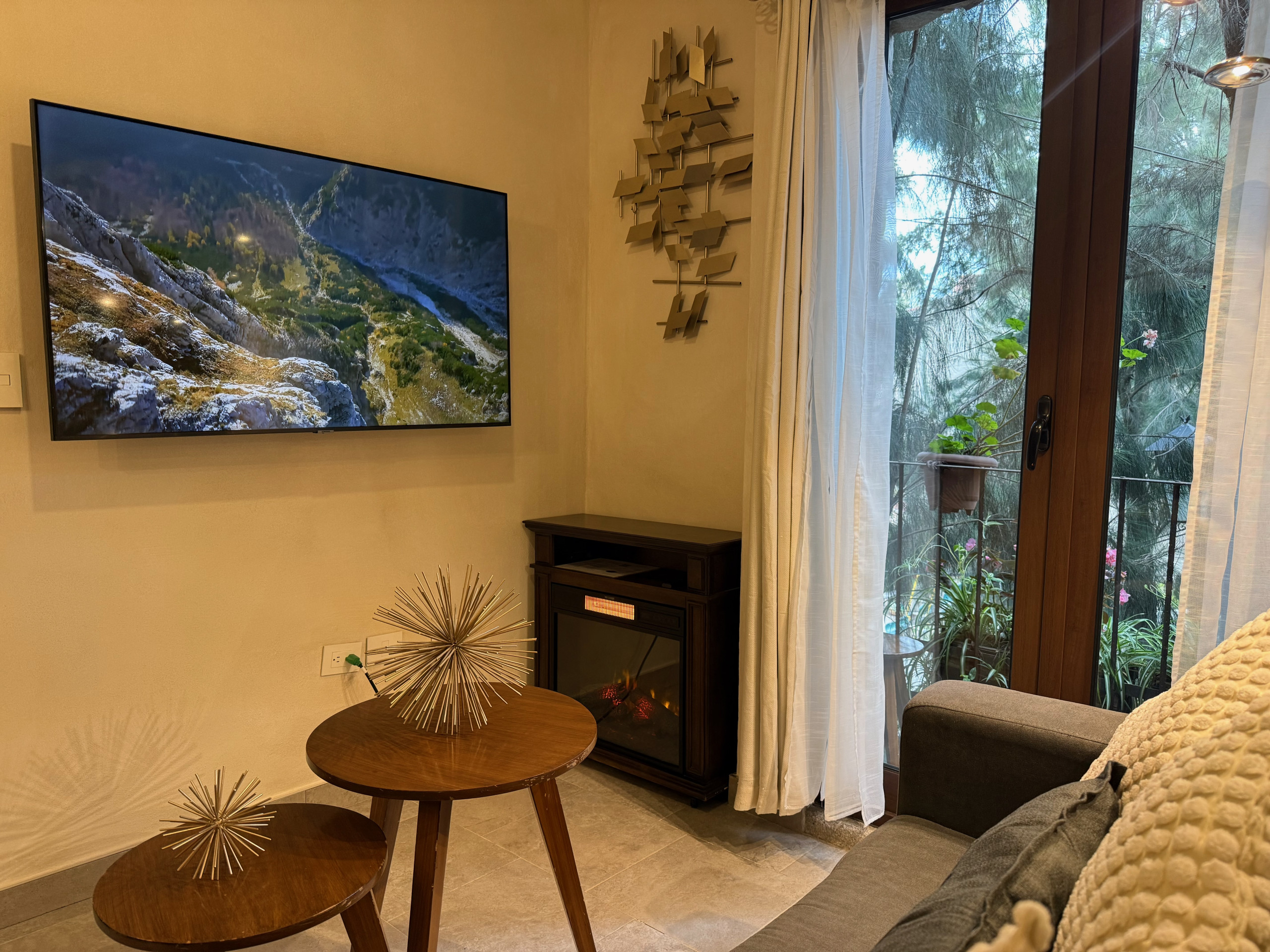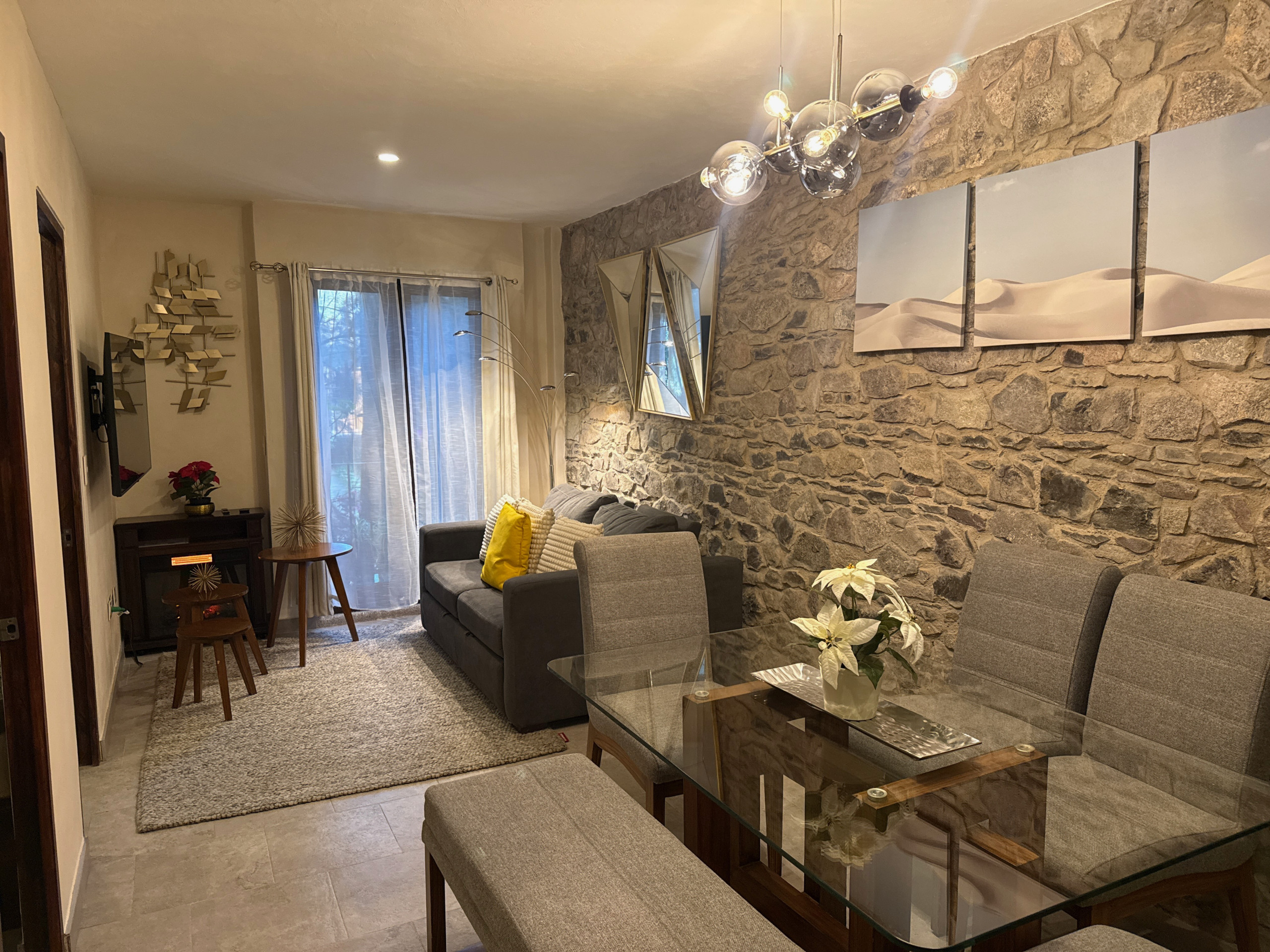 Dispone de terraza, asador, chimenea, plancha, caja fuerte, acceso internet (wifi), secadora, balcón, calefacción radiadores eléctricos, alberca comunitaria, alberca climatizada comunitaria, estacionamiento en edificio cercano, 1 ventilador, 1 Televisión.