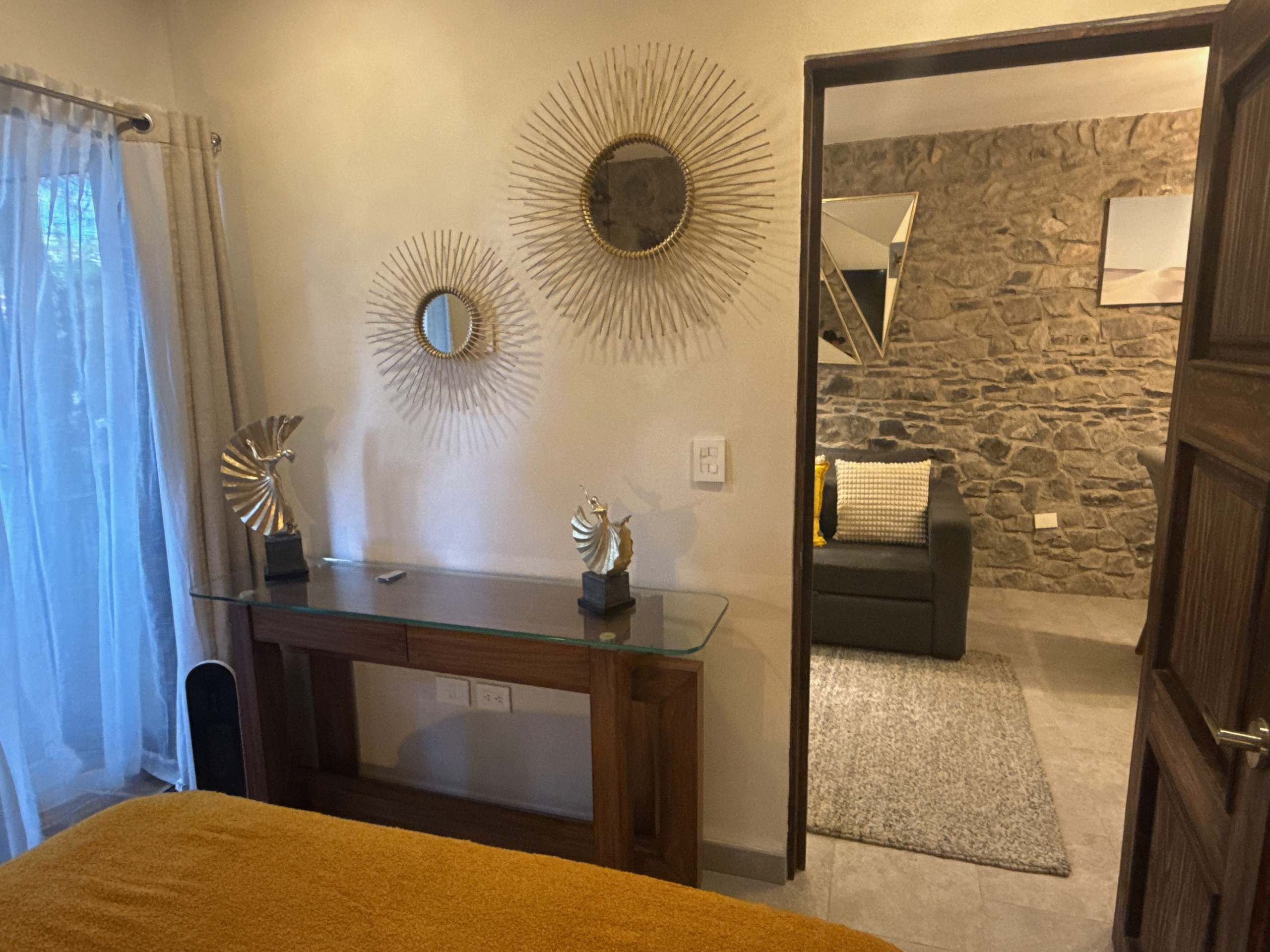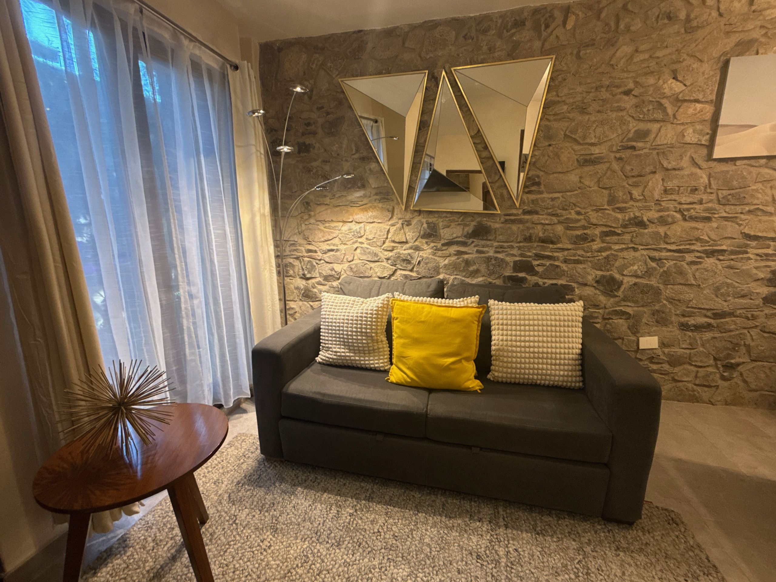 El departamento en Val’Quirico posee 1 habitaciones y capacidad para 4 personas. Alojamiento de 45 m². Dispone de terraza, asador, chimenea, plancha, caja fuerte, acceso internet (wifi), secadora, balcón, calefacción radiadores eléctricos, alberca comunitaria, alberca climatizada comunitaria, estacionamiento en edificio cercano, 1 ventilador, 1 Televisión.La cocina americana, eléctrica, está equipada con refrigerador, microondas, vajilla/cubertería, utensilios/cocina y cafetera.