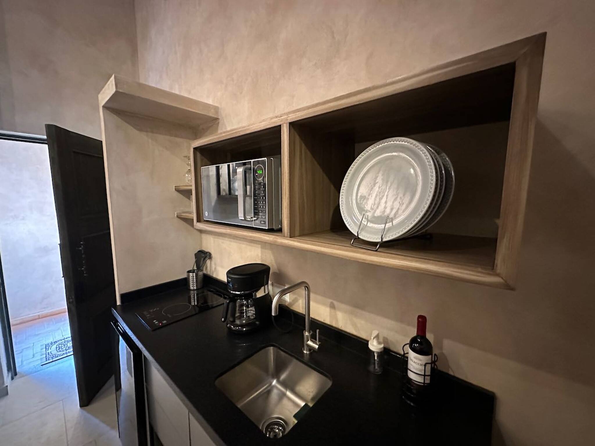 La cocina, está equipada con refrigerador, microondas, vajilla/cubertería, utensilios/cocina y cafetera.