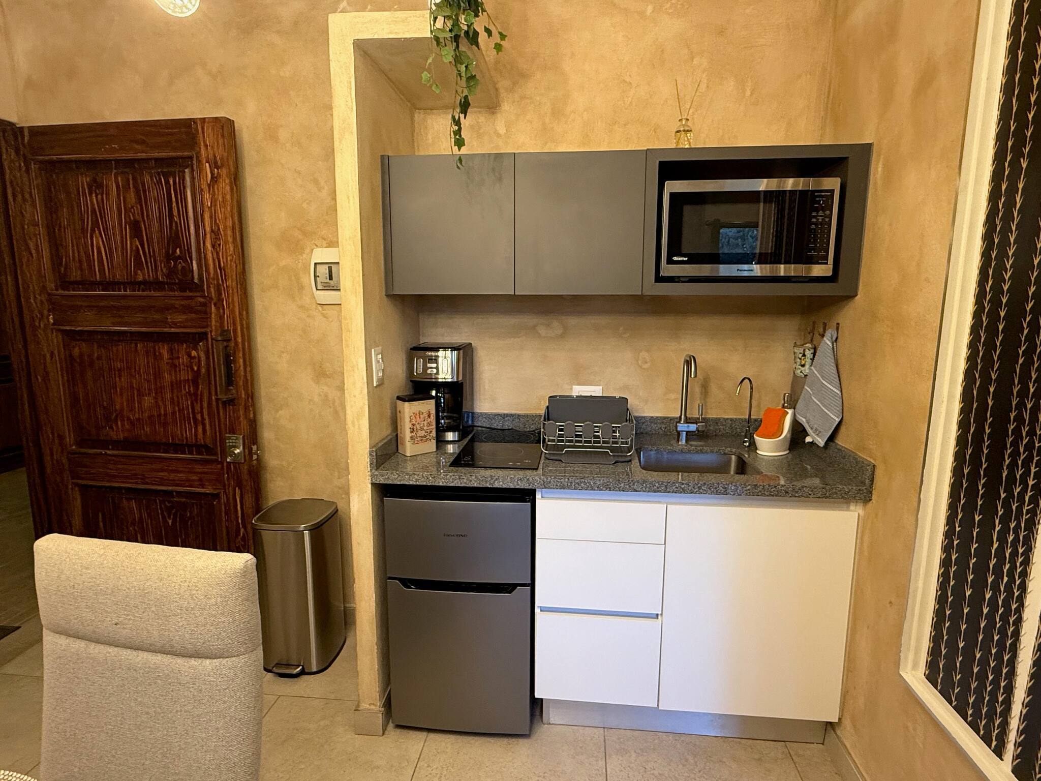 La cocina americana, de inducción, está equipada con refrigerador, microondas, vajilla/cubertería, utensilios/cocina y cafetera.
