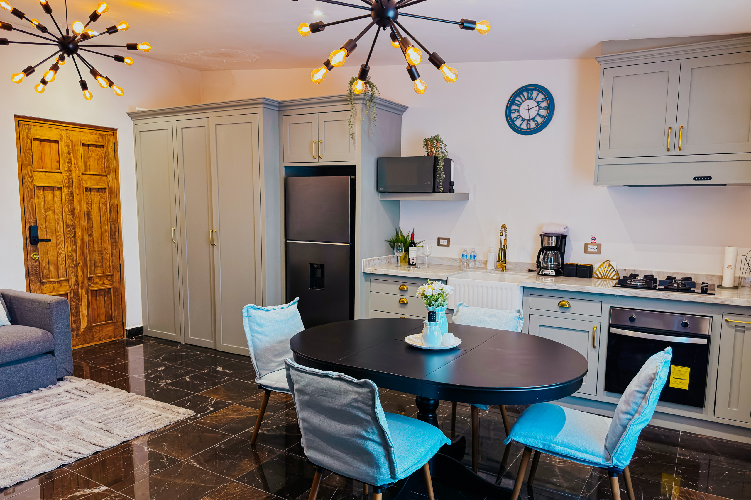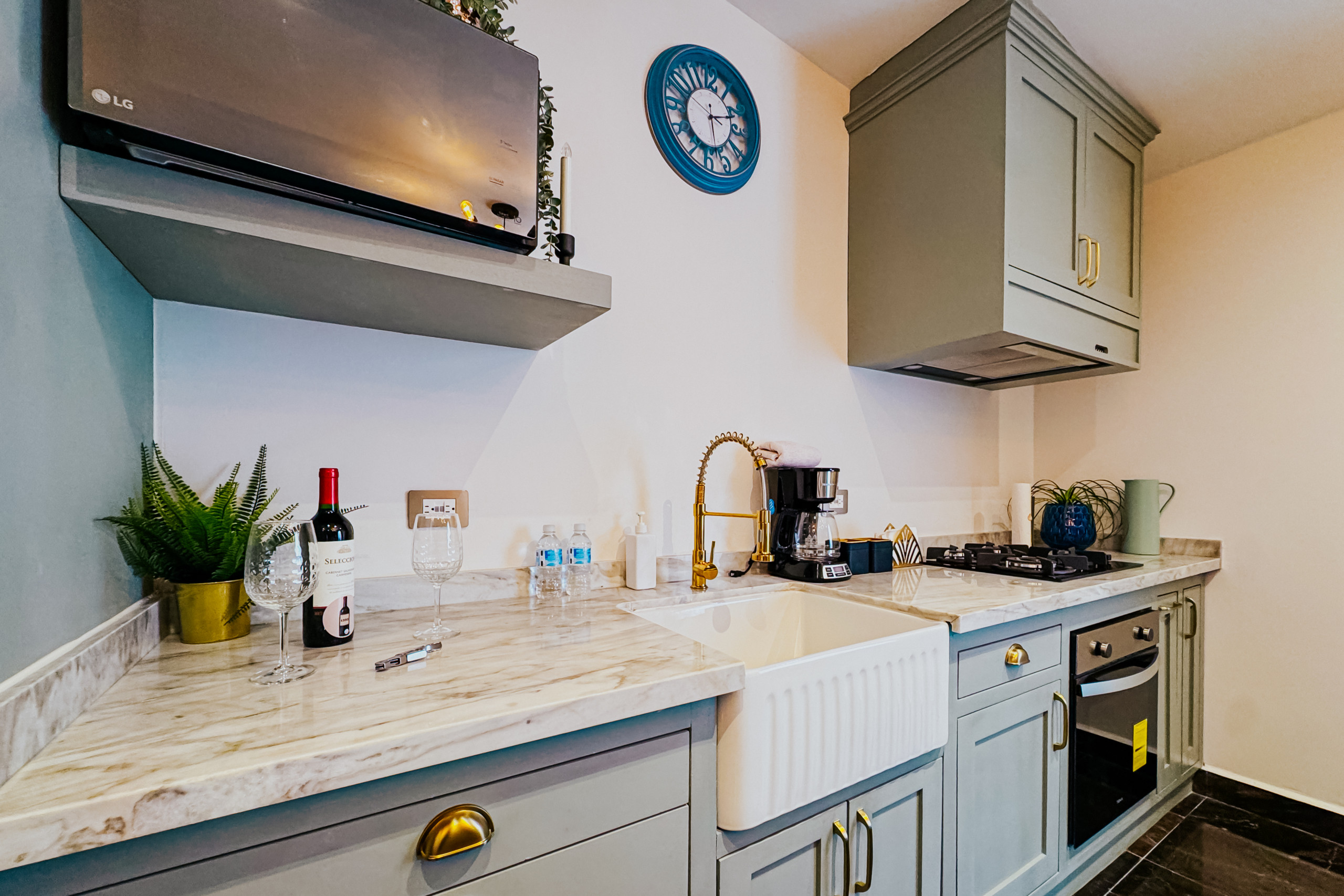 La cocina americana, de gas, está equipada con refrigerador, microondas, horno, congelador, vajilla/cubertería, utensilios/cocina, cafetera, hervidor de agua y fogones.