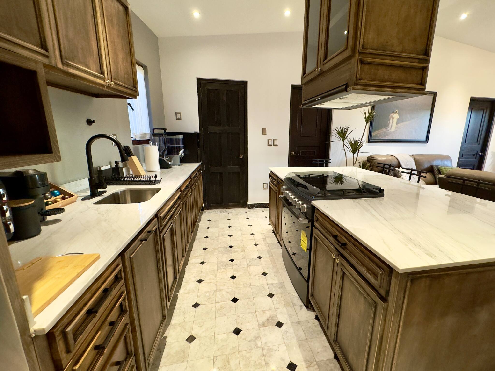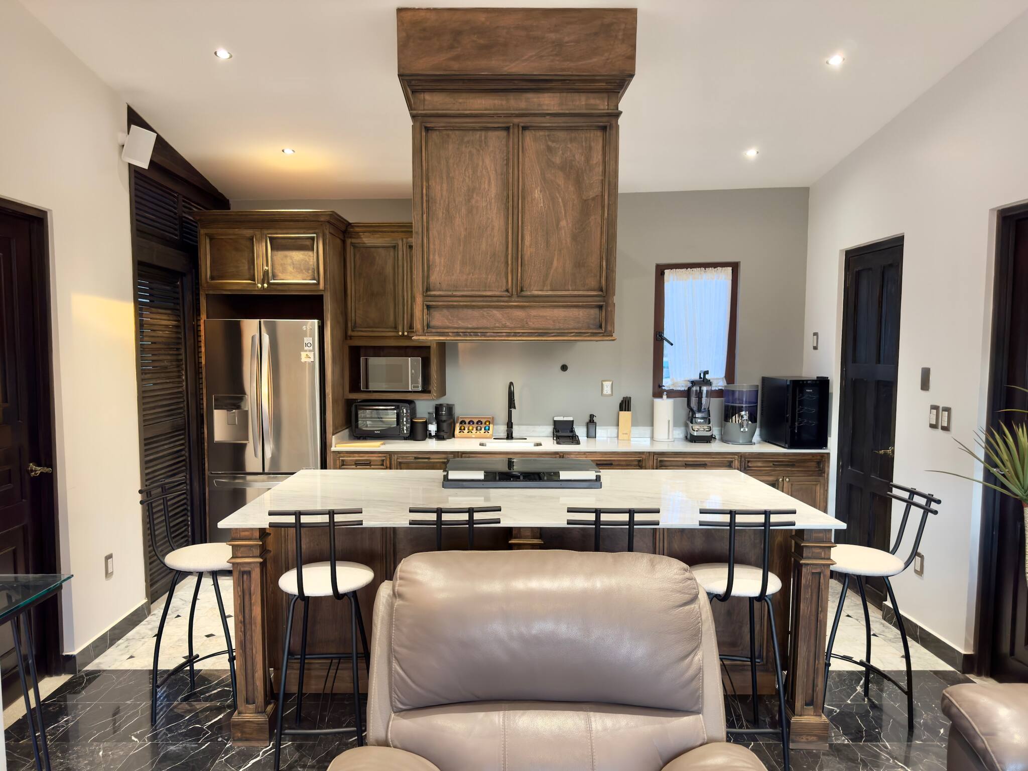 La cocina americana, de gas, está equipada con refrigerador, microondas, congelador, vajilla/cubertería, utensilios/cocina, cafetera y fogones.