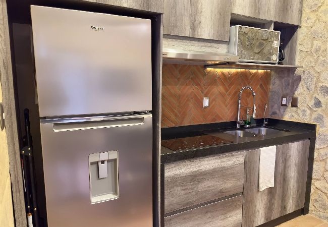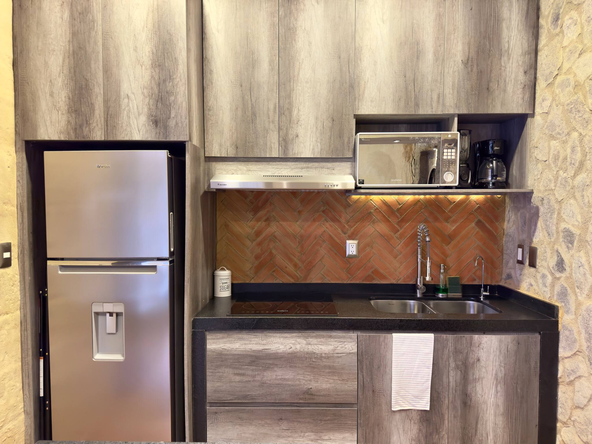 La cocina americana, de gas, está equipada con refrigerador, microondas, vajilla/cubertería, utensilios/cocina, cafetera y fogones.