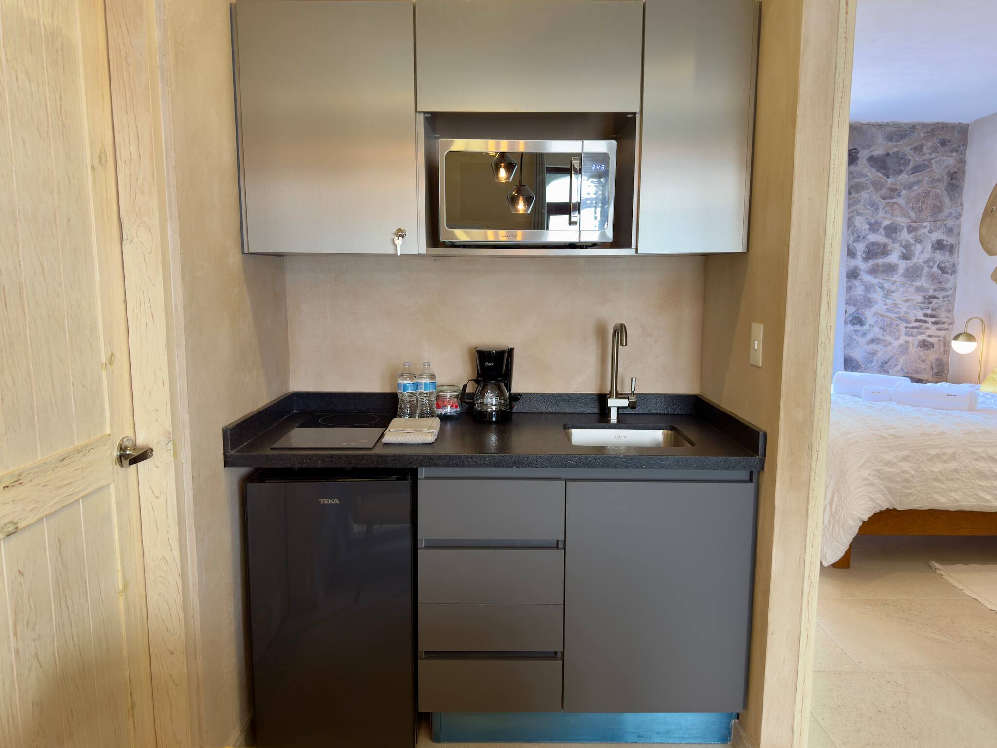 The American kitchen is fully equipped with state-of-the-art appliances, including an induction cooktop, microwave, coffee maker, refrigerator, and all the necessary utensils to prepare delicious meals. In addition, it has a practical work area with WiFi connection for those who need to combine leisure and work.