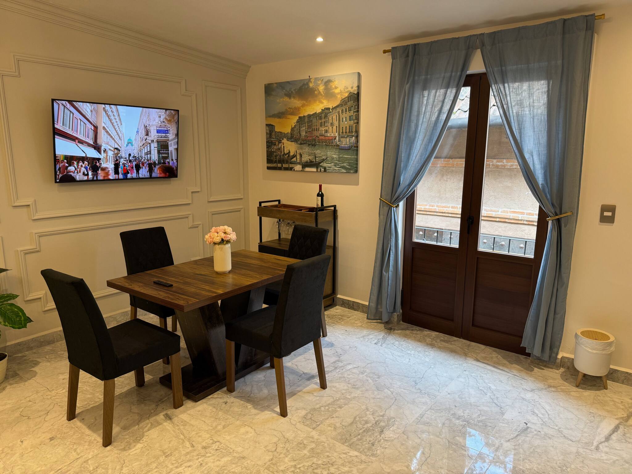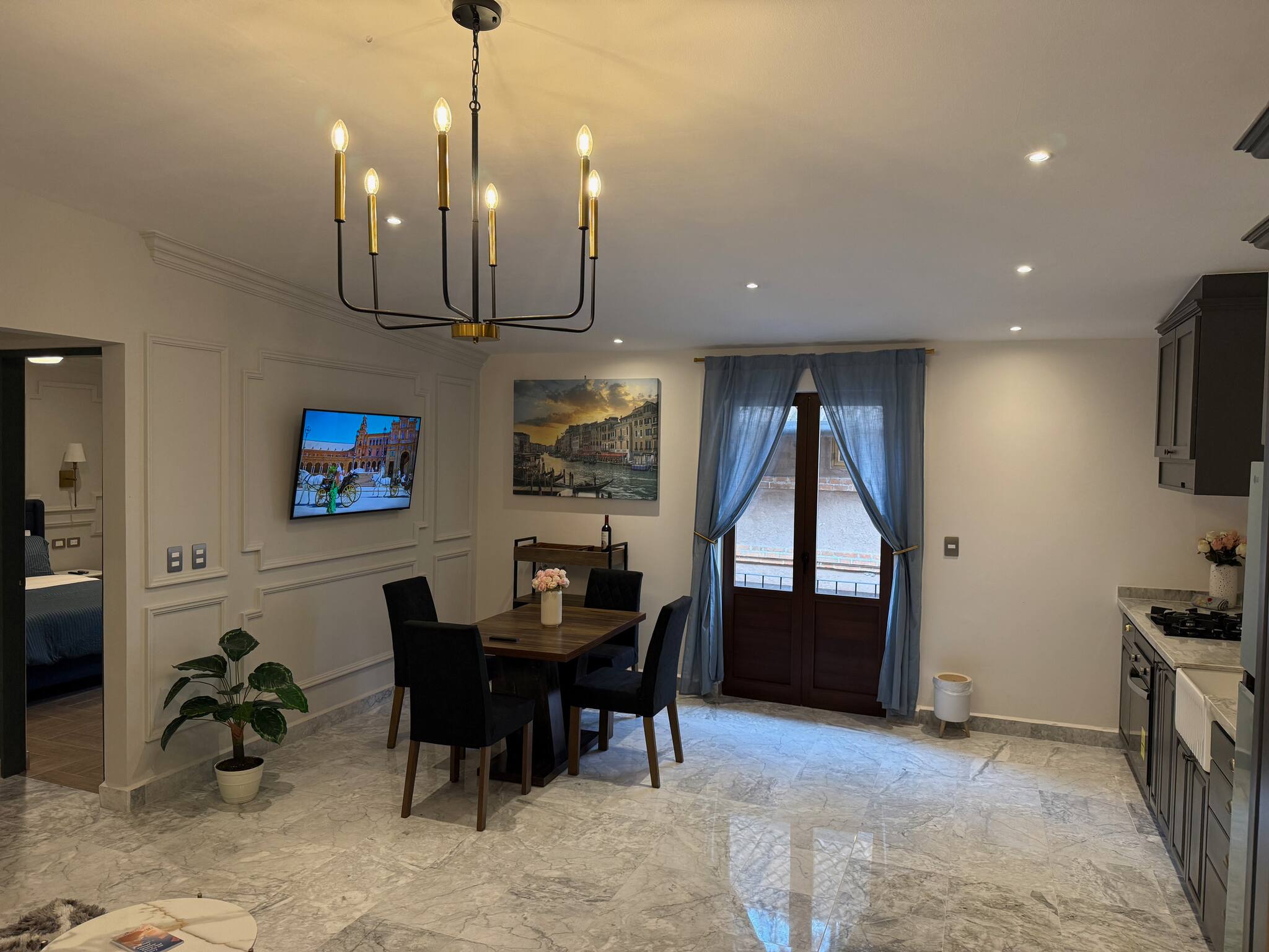 The American kitchen is fully equipped with state-of-the-art appliances, including an induction cooktop, microwave, coffee maker, refrigerator, and all the necessary utensils to prepare delicious meals. In addition, it has a practical work area with WiFi connection for those who need to combine leisure and work.