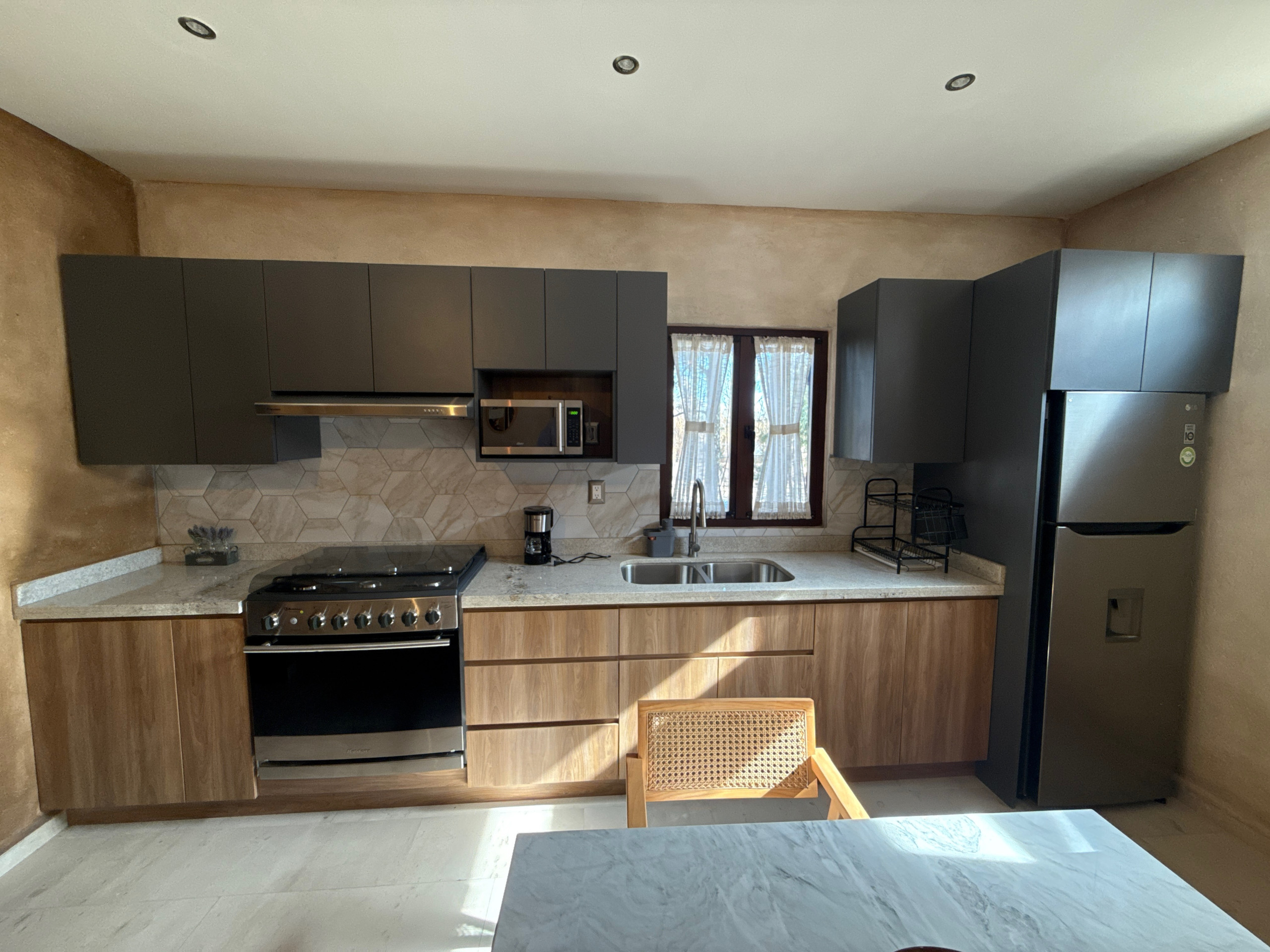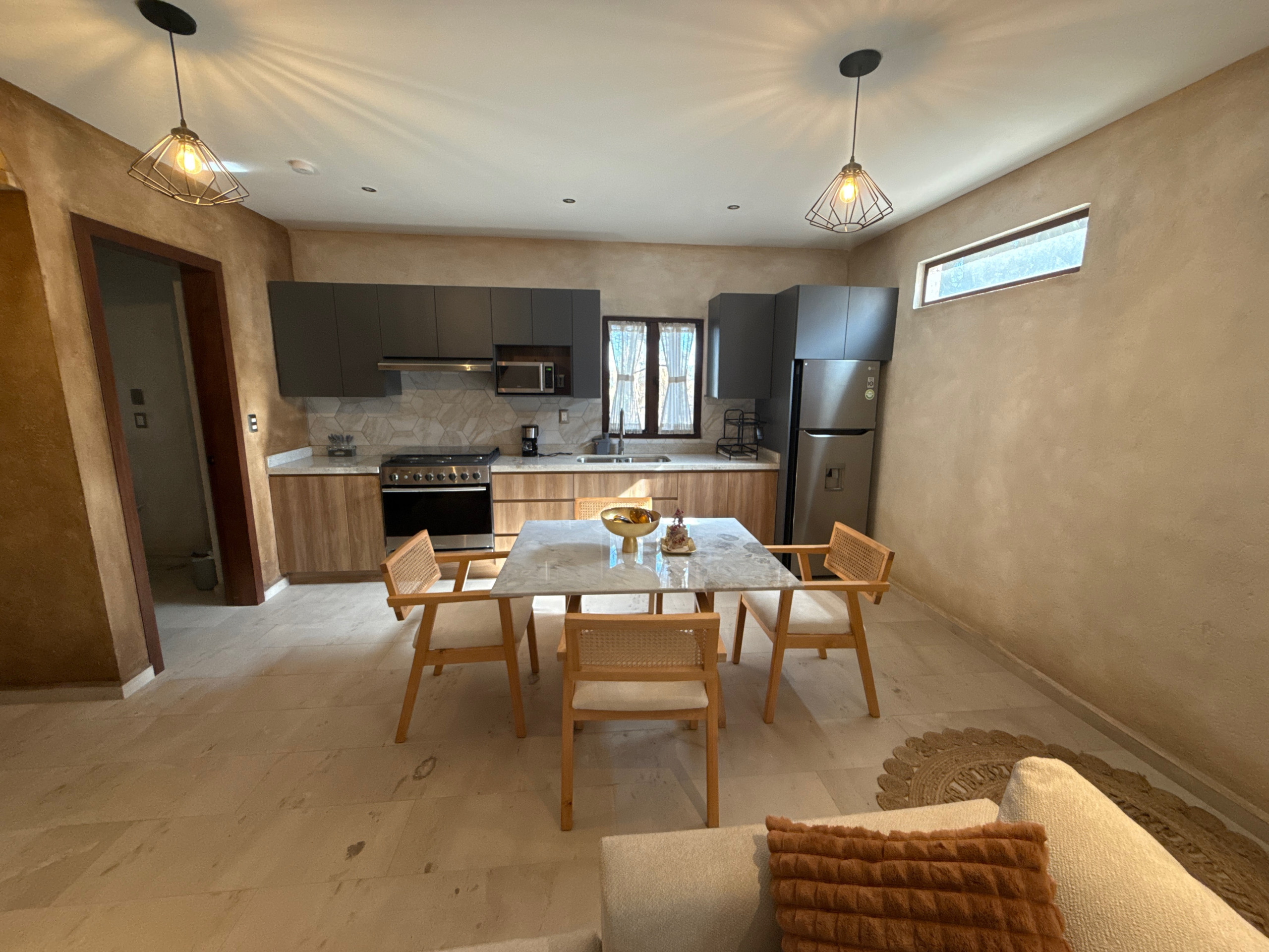 The American kitchen is fully equipped with state-of-the-art appliances, including an induction cooktop, microwave, coffee maker, refrigerator, and all the necessary utensils to prepare delicious meals. In addition, it has a practical work area with WiFi connection for those who need to combine leisure and work.