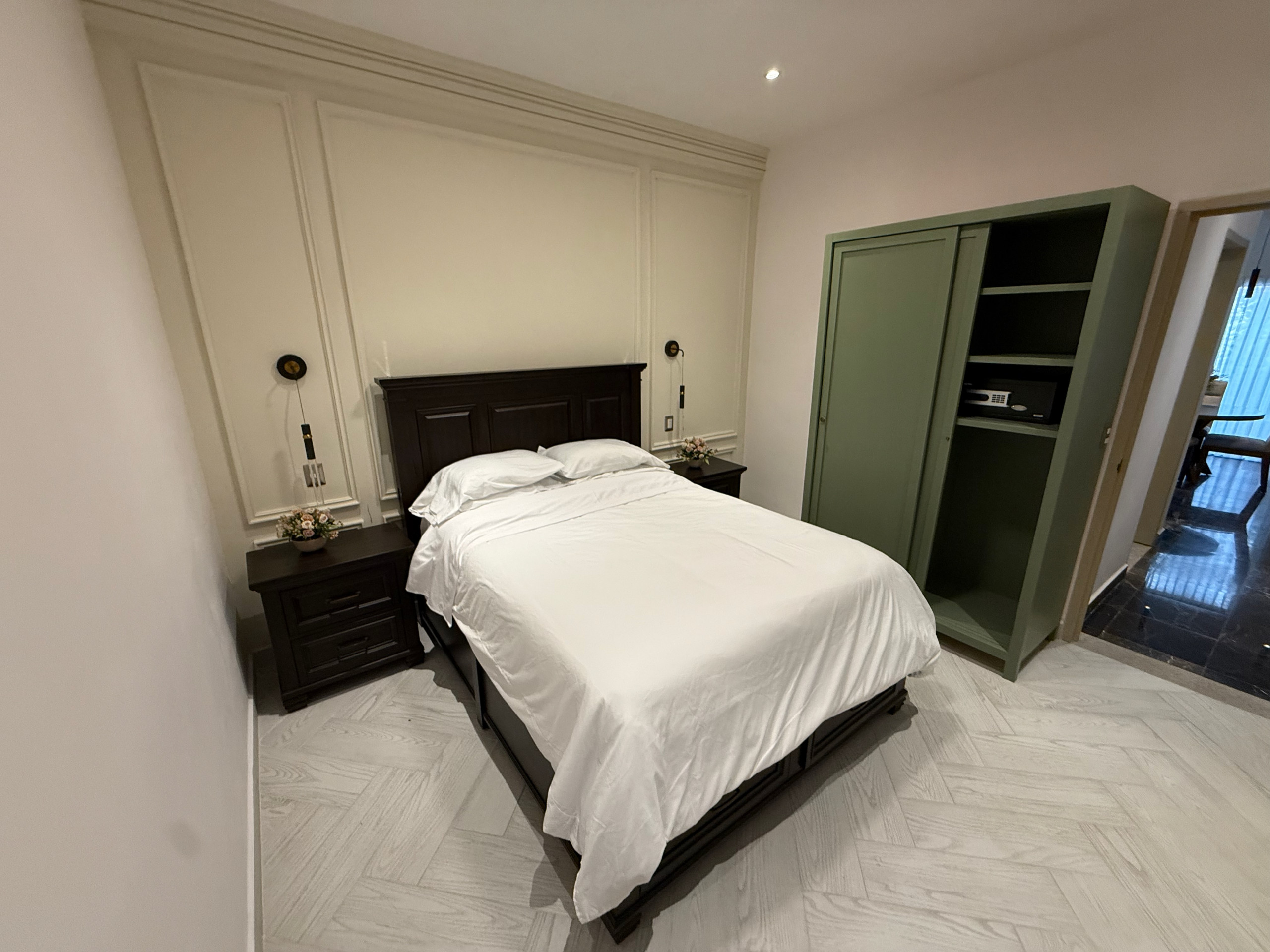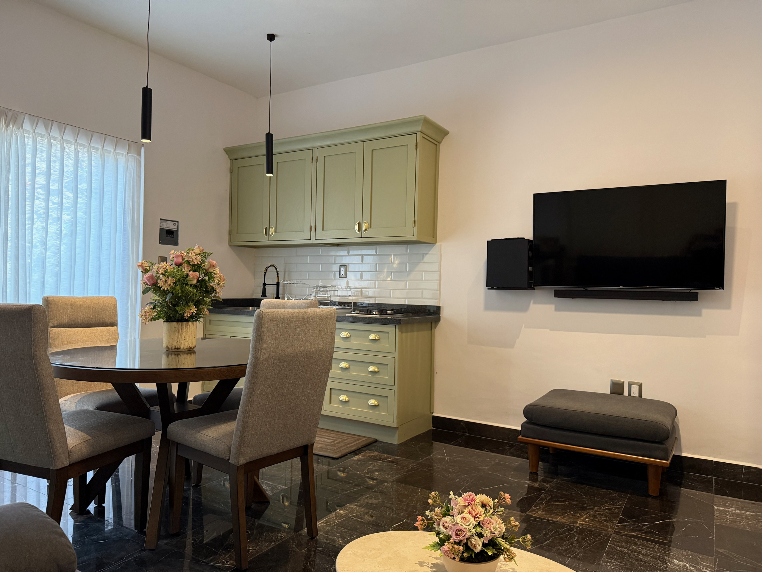 The American kitchen is fully equipped with state-of-the-art appliances, including an induction cooktop, microwave, coffee maker, refrigerator, and all the necessary utensils to prepare delicious meals. In addition, it has a practical work area with WiFi connection for those who need to combine leisure and work.