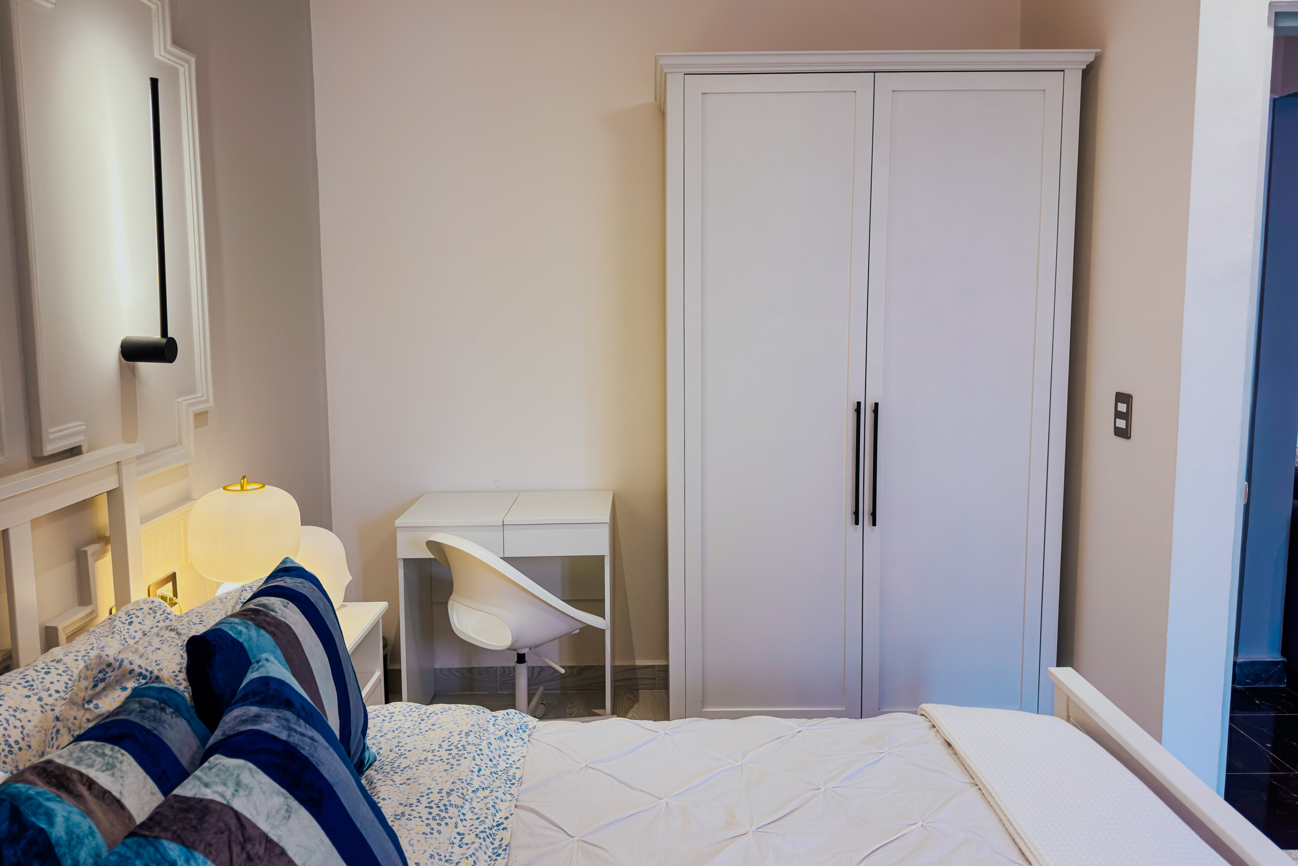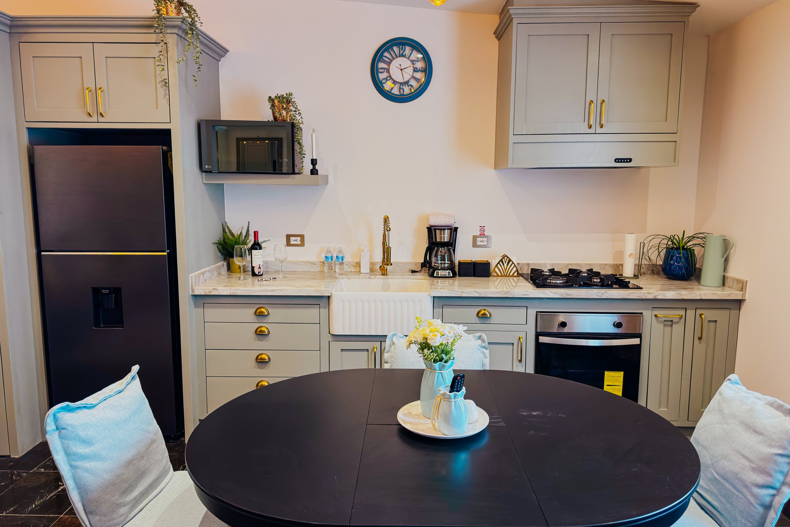 The American kitchen is fully equipped with modern appliances, including stove, oven, microwave, refrigerator, freezer, and coffee maker. You will find all the necessary kitchen utensils to prepare delicious meals during your stay. The area has a quiet atmosphere and is located near restaurants and shops.