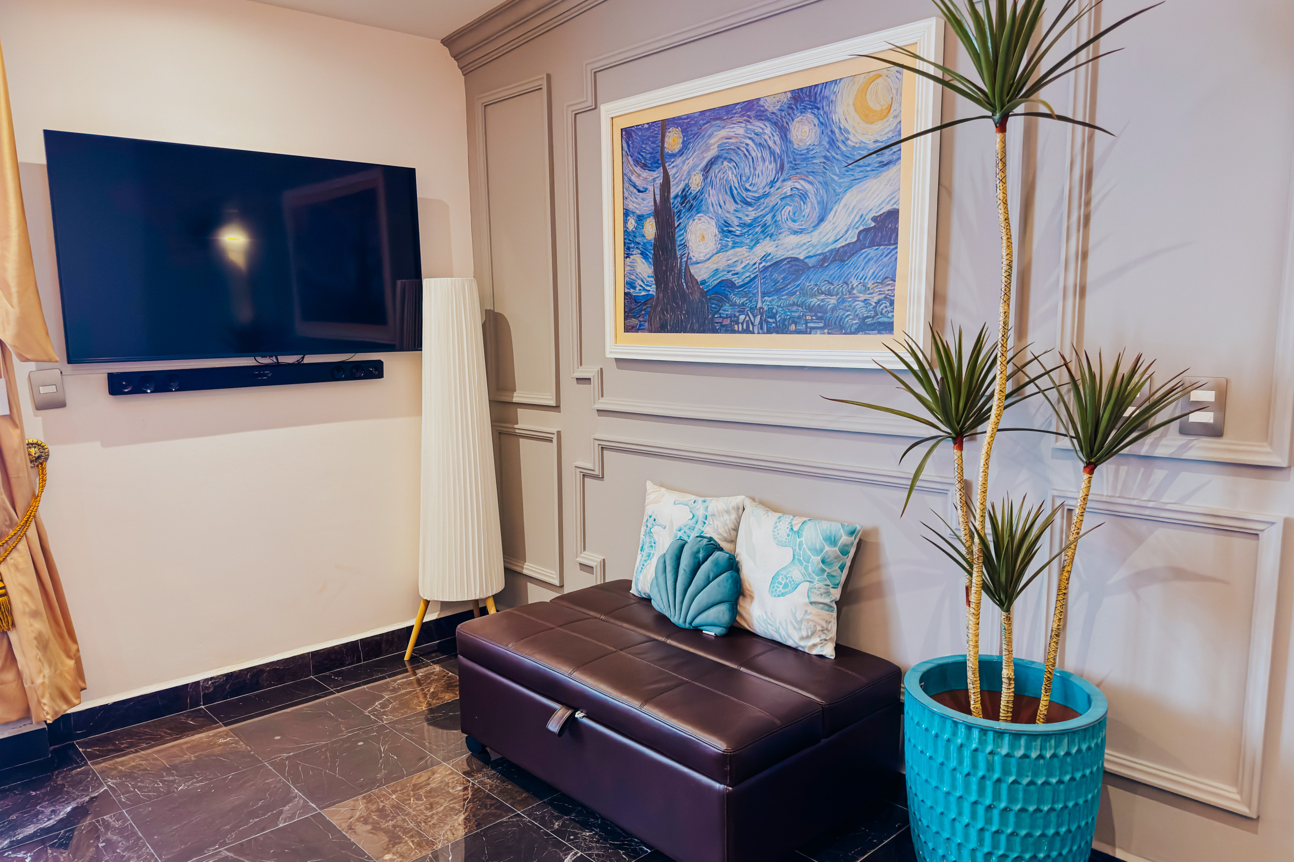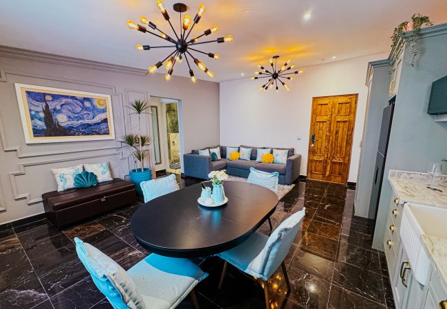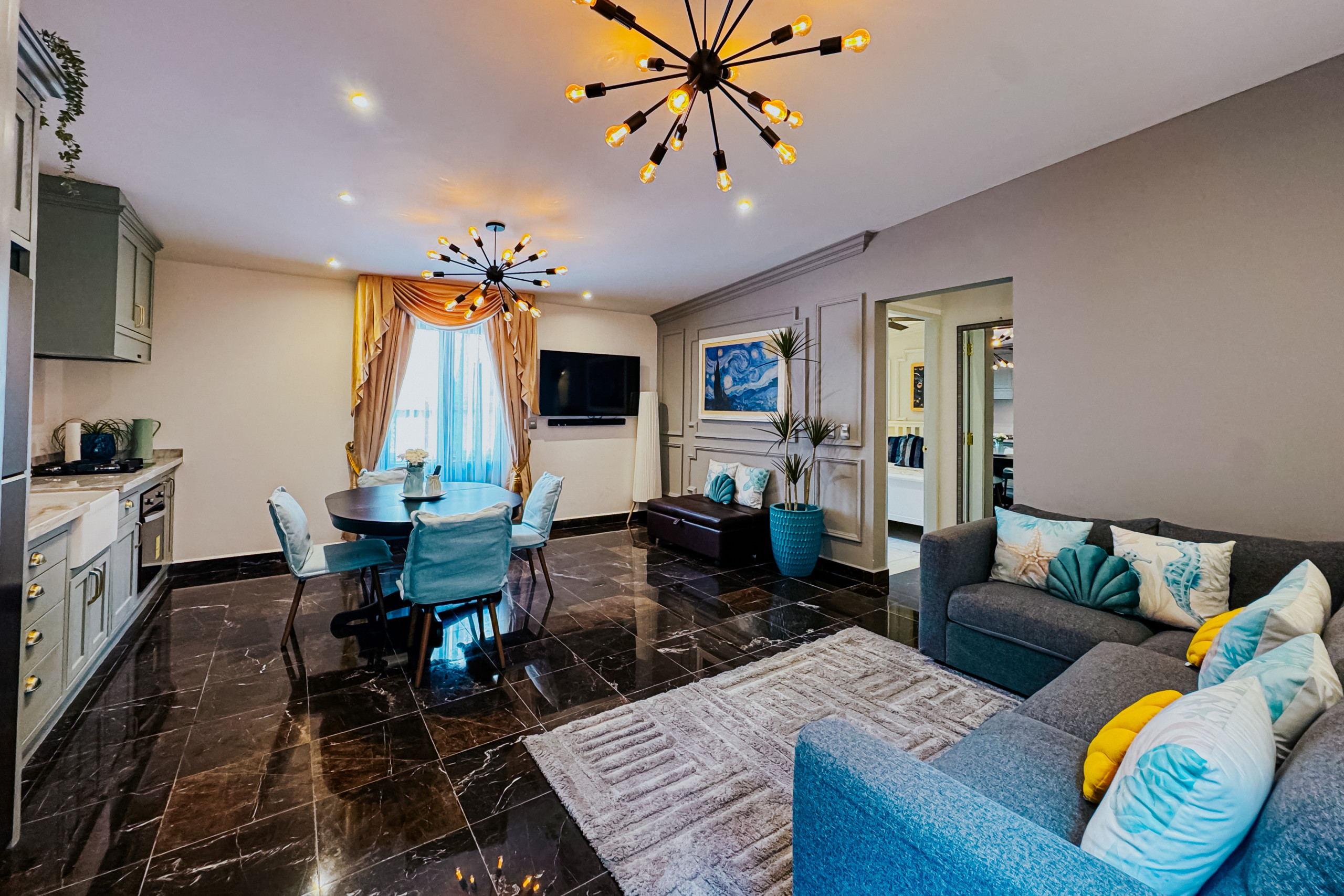 The apartment features a main bedroom equipped with a king-size bed, as well as a sofa bed and an additional sofa, allowing for a flexible layout for different types of travelers. The decor is carefully selected, offering an elegant and functional atmosphere.