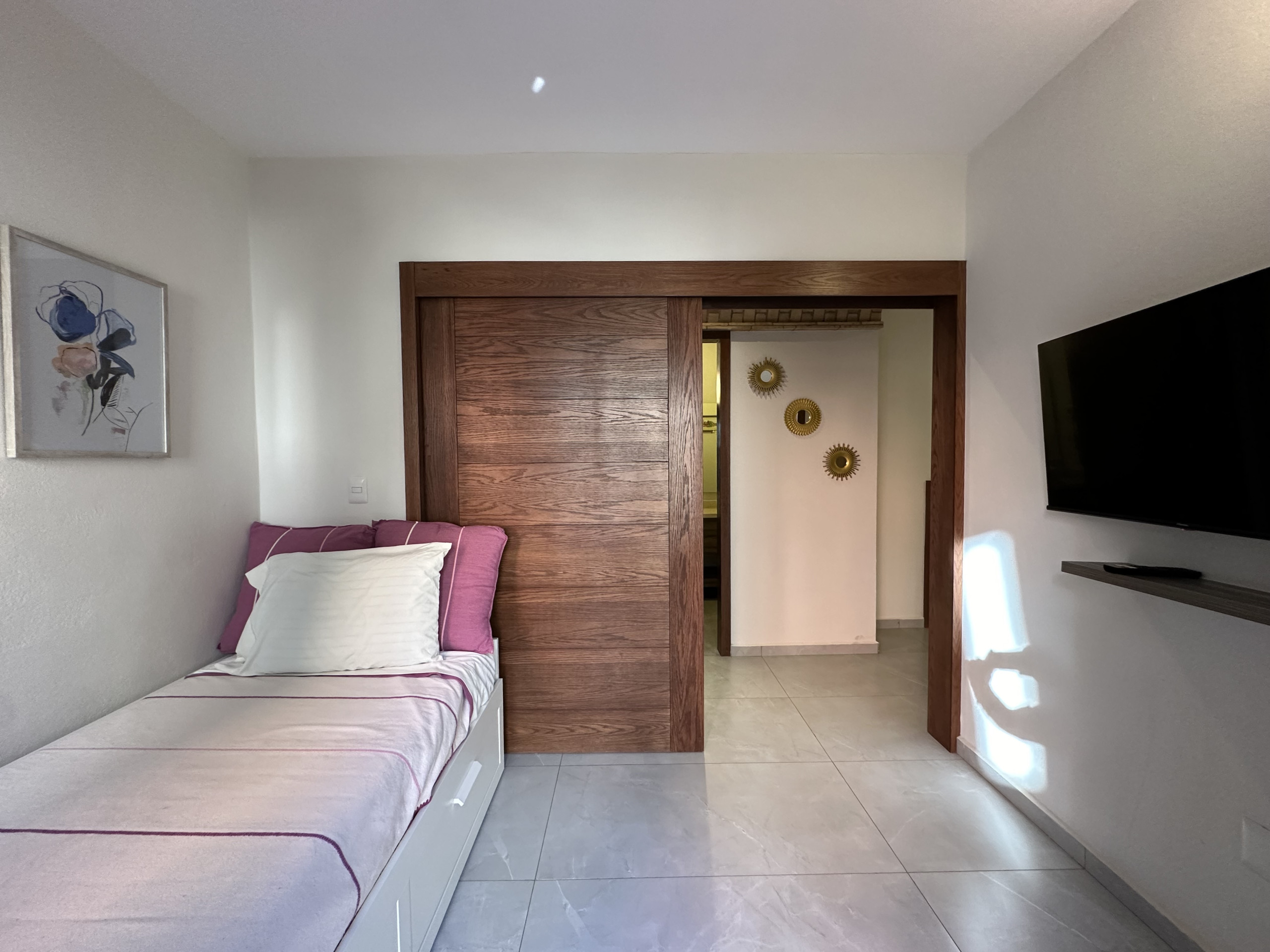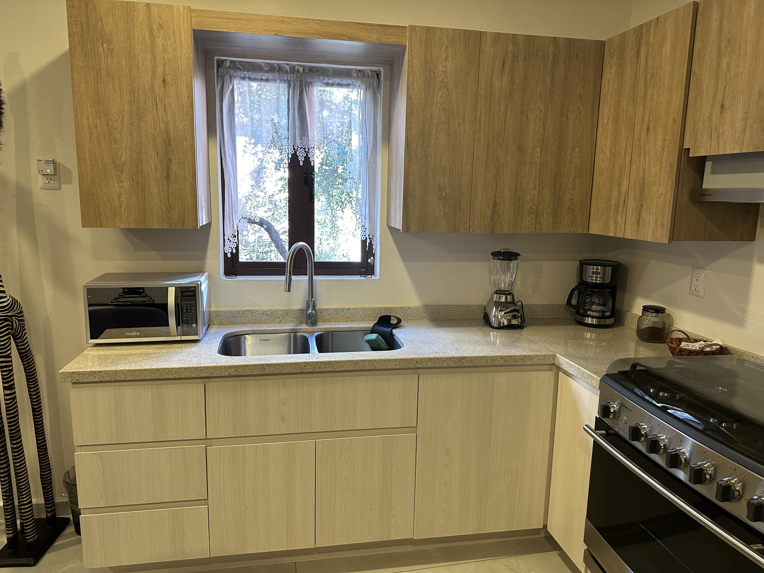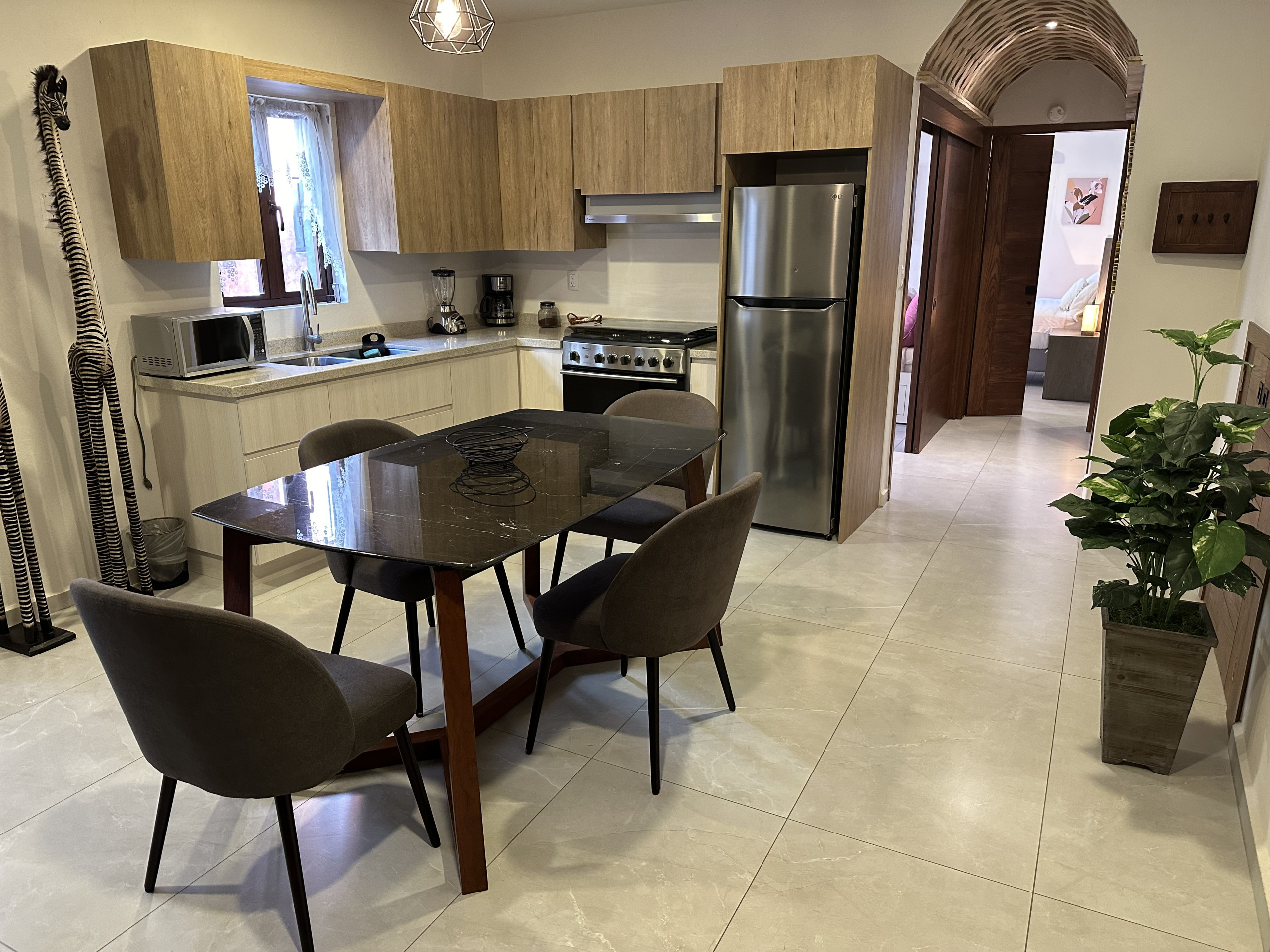 The American kitchen is fully equipped with state-of-the-art appliances, including an induction cooktop, microwave, coffee maker, refrigerator, and all the necessary utensils to prepare delicious meals. In addition, it has a practical work area with WiFi connection for those who need to combine leisure and work.