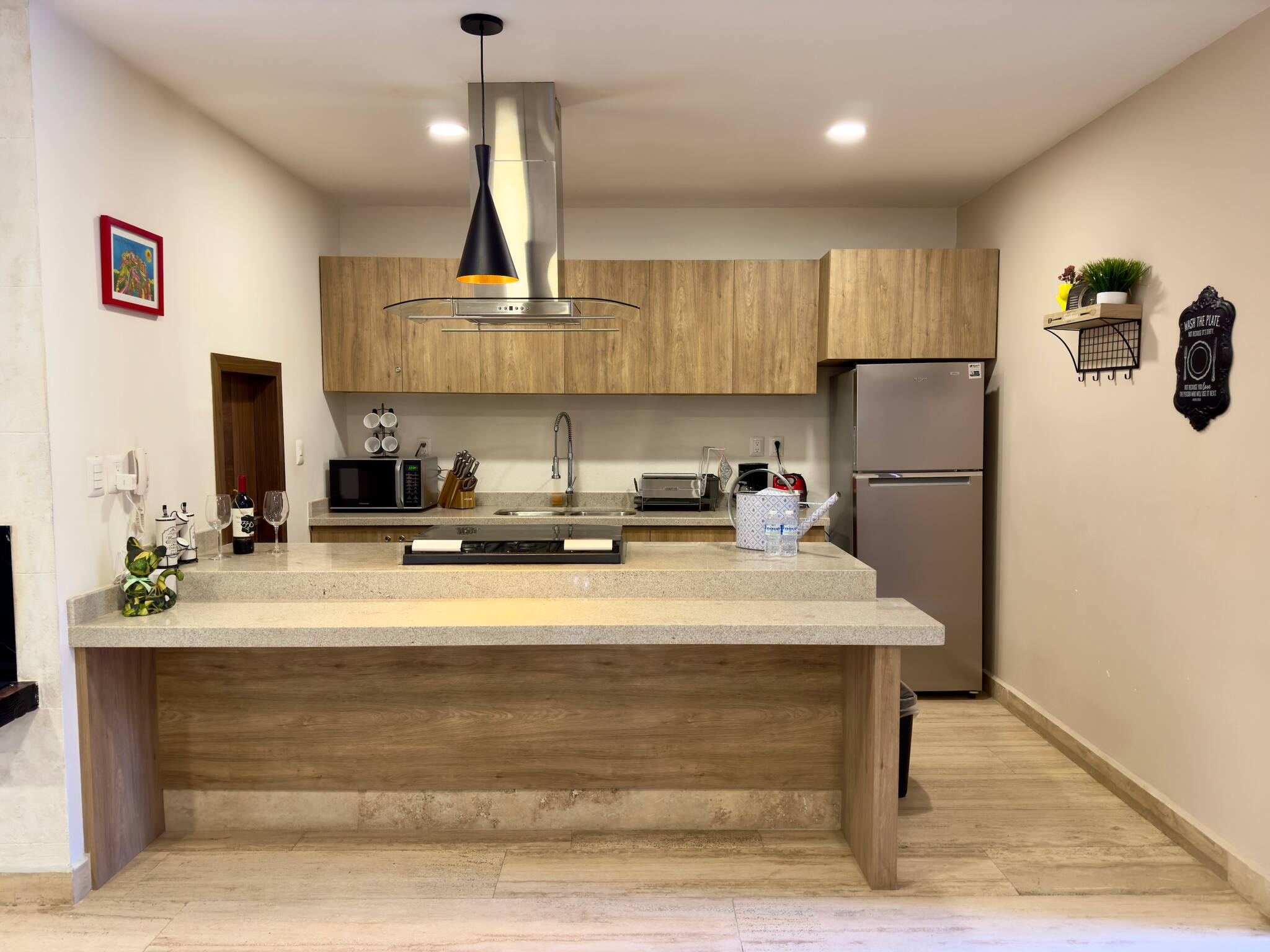 In the gas open plan kitchen, refrigerator, microwave, oven, freezer, dishes/cutlery, kitchen utensils, coffee machine, toaster and stove are provided.