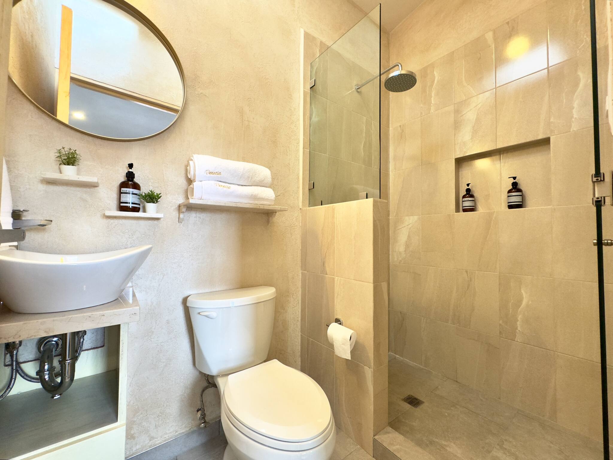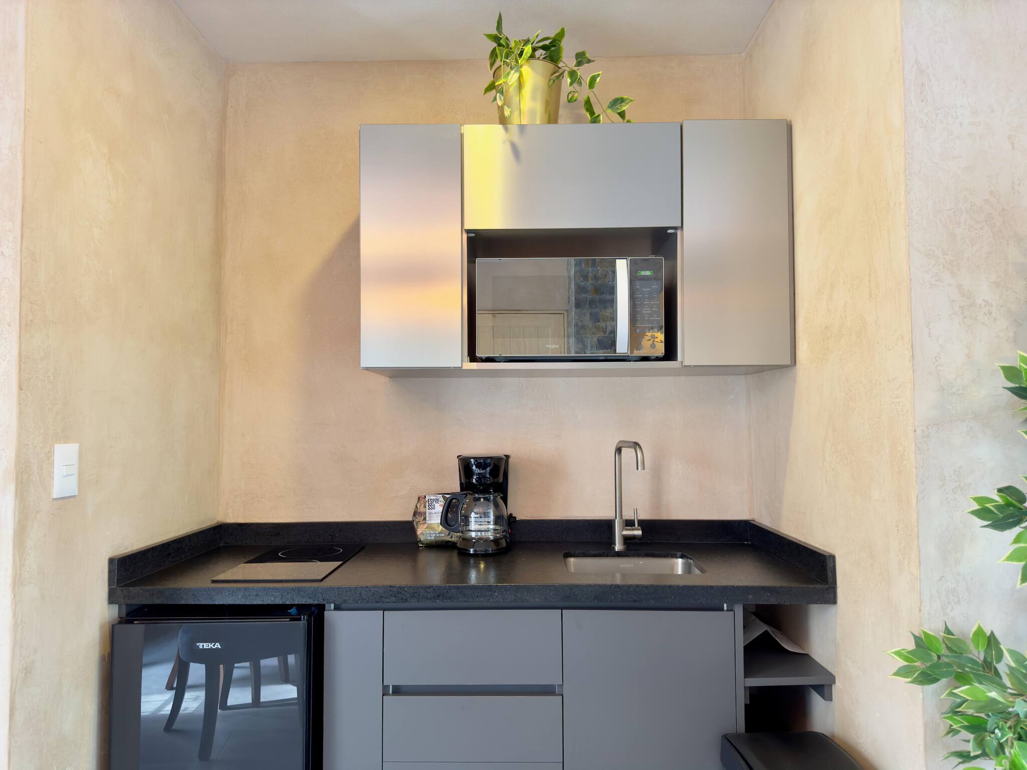 The American kitchen is fully equipped with state-of-the-art appliances, including an induction cooktop, microwave, coffee maker, refrigerator, and all the necessary utensils to prepare delicious meals. In addition, it has a practical work area with WiFi connection for those who need to combine leisure and work.